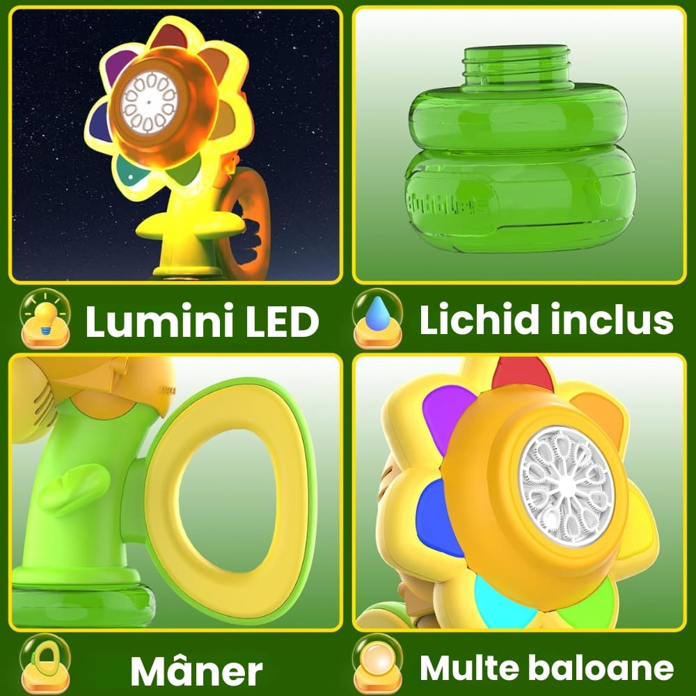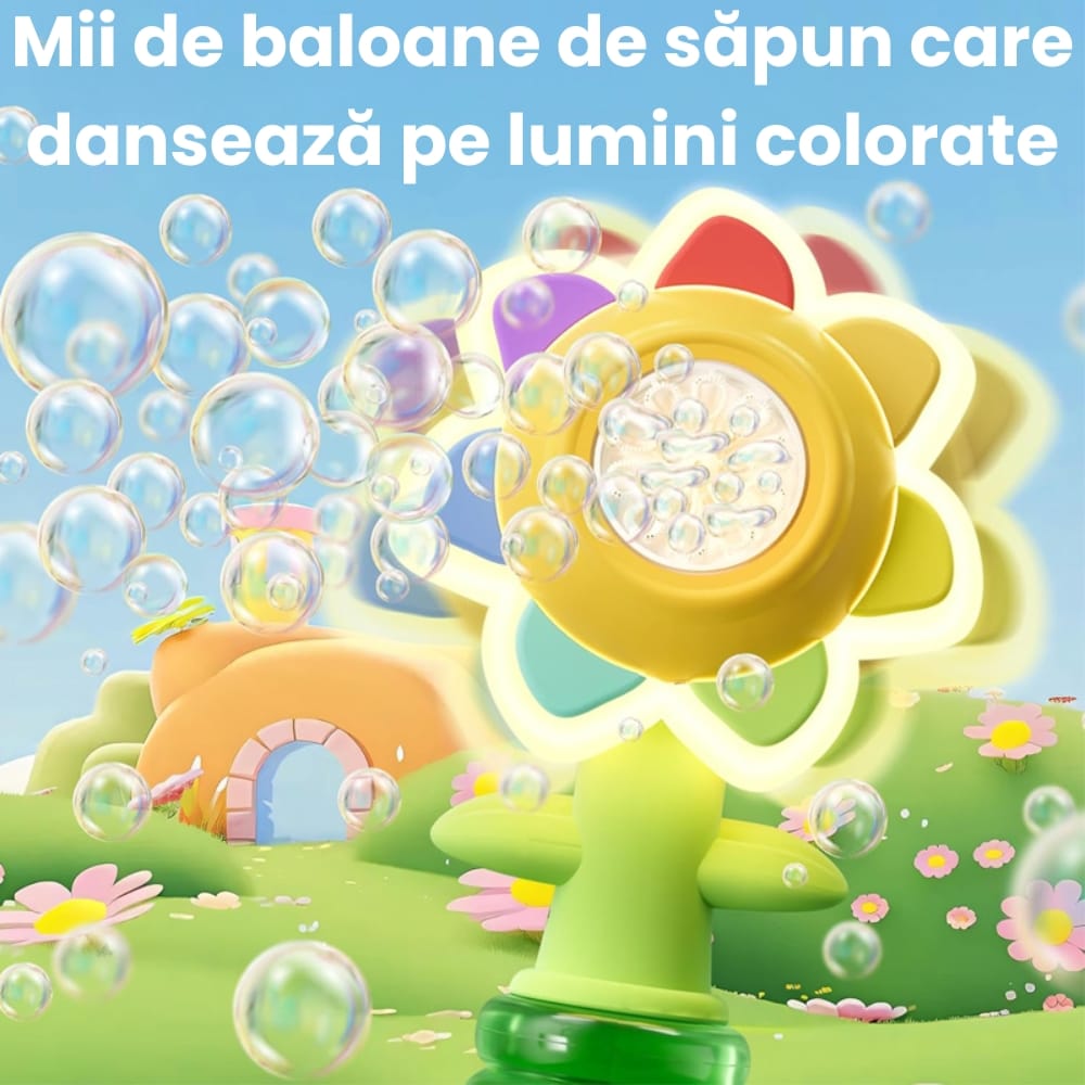 Aparat de Făcut Baloane de Săpun Formă Floare, 3 Moduri, Lumini LED, Anti-Scurgere, Lichid Inclus, +3 Ani