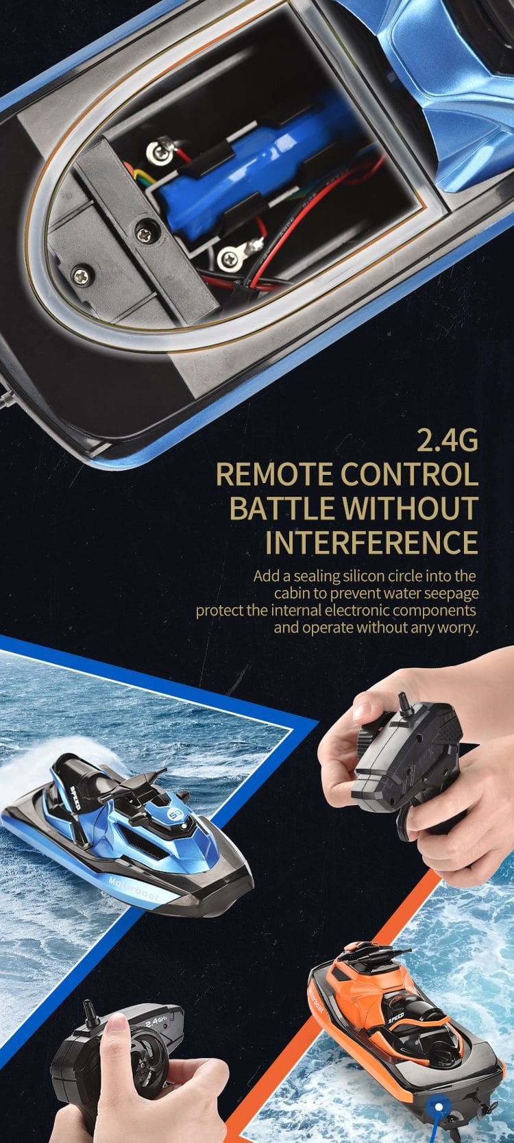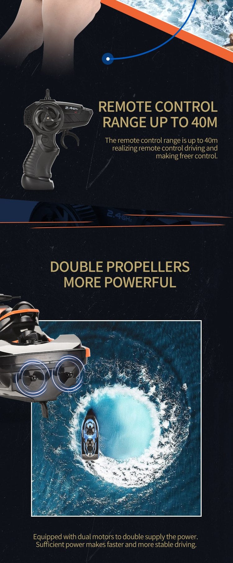 Raza mare de actiune de aproximativ 40 de metri la capacitatea maxima a bateriilor da posibilitatea jocului atat in piscine acasa cat si pe lacuri de mici dimensiuni.
