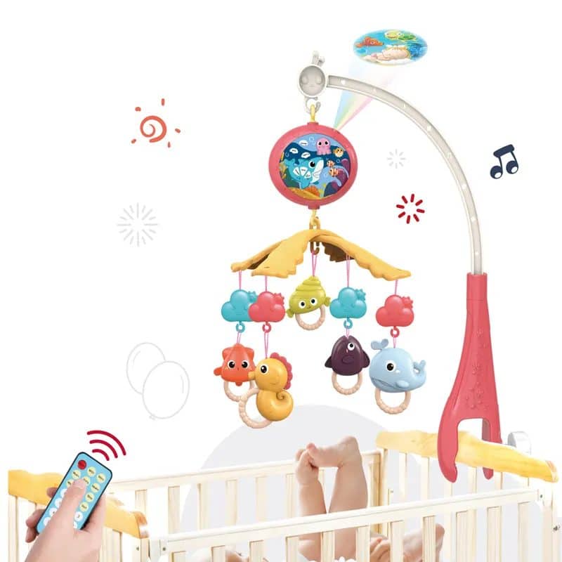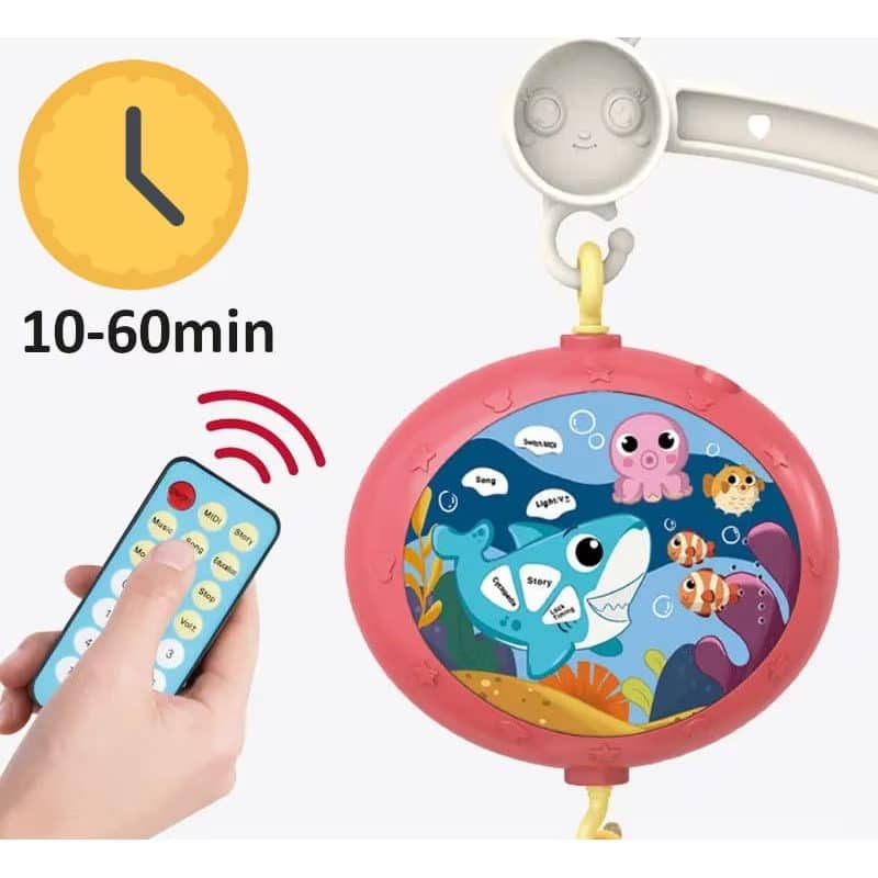 -In plus, caruselul are un mini proiector cu un copil care doarme si animale marine activate de o telecomanda