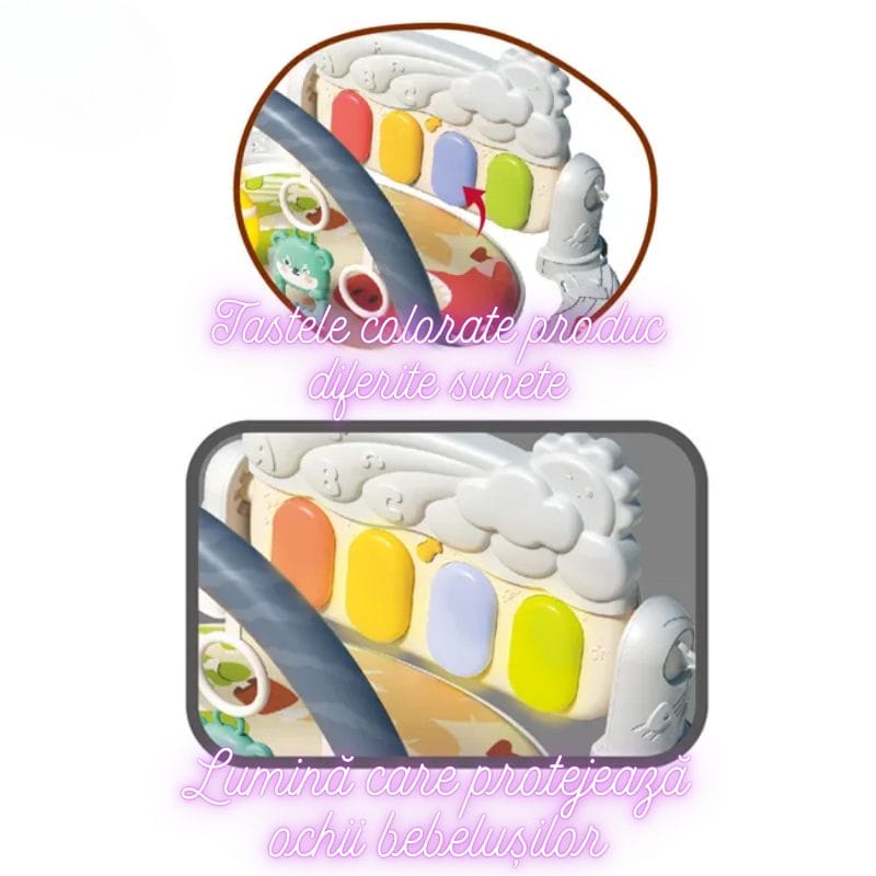 Centru de activitati interactiv si educativ pentru bebelusi, conceput pentru a transforma fiecare moment de joaca intr-o oportunitate de invatare si explorare. Acest covoras multifunctional este perfect pentru parintii care isi doresc sa stimuleze dezvoltarea cognitiva, senzoriala si motrica a copilului intr-un mod sigur si plin de bucurie. Cu o combinatie inovatoare de sunete muzicale, jucarii viu colorate, un pian interactiv si lumina delicata, acest centru este alegerea ideala pentru fiecare etapa de crestere a copilului tau.