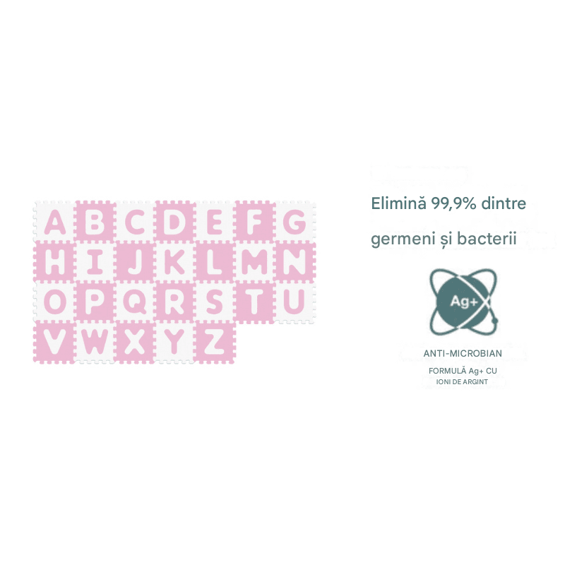 Covorasul puzzle antibacterian LUDIRO este alegerea ideala pentru parintii care doresc sa ofere copiilor lor un mediu sigur, curat si educativ inca din primele luni de viata. Acest set este compus din 26 de piese interconectabile, fiecare ilustrand o litera a alfabetului, fiind realizat din spuma EVA de inalta calitate, moale si non-toxica. Unicitatea acestui produs consta in tehnologia antibacteriana inovatoare cu ioni de argint (Ag+), ce elimina 99,9% dintre germeni si bacterii, protejand sanatatea copilului in fiecare moment al jocului.