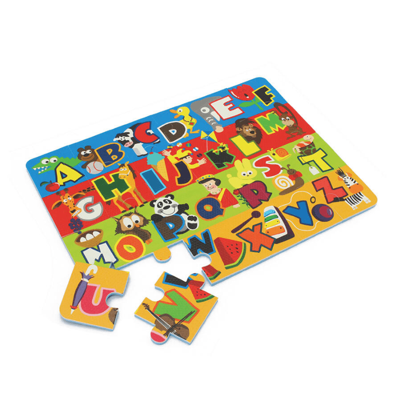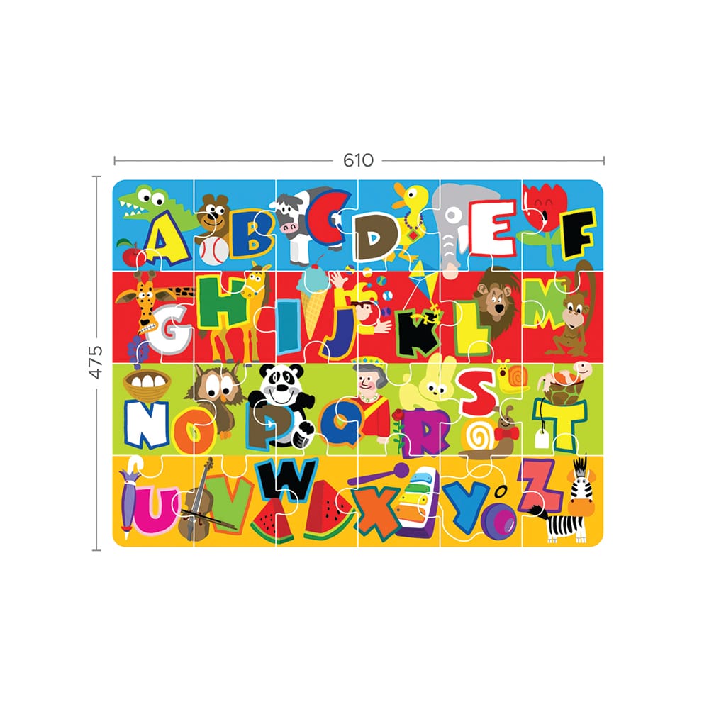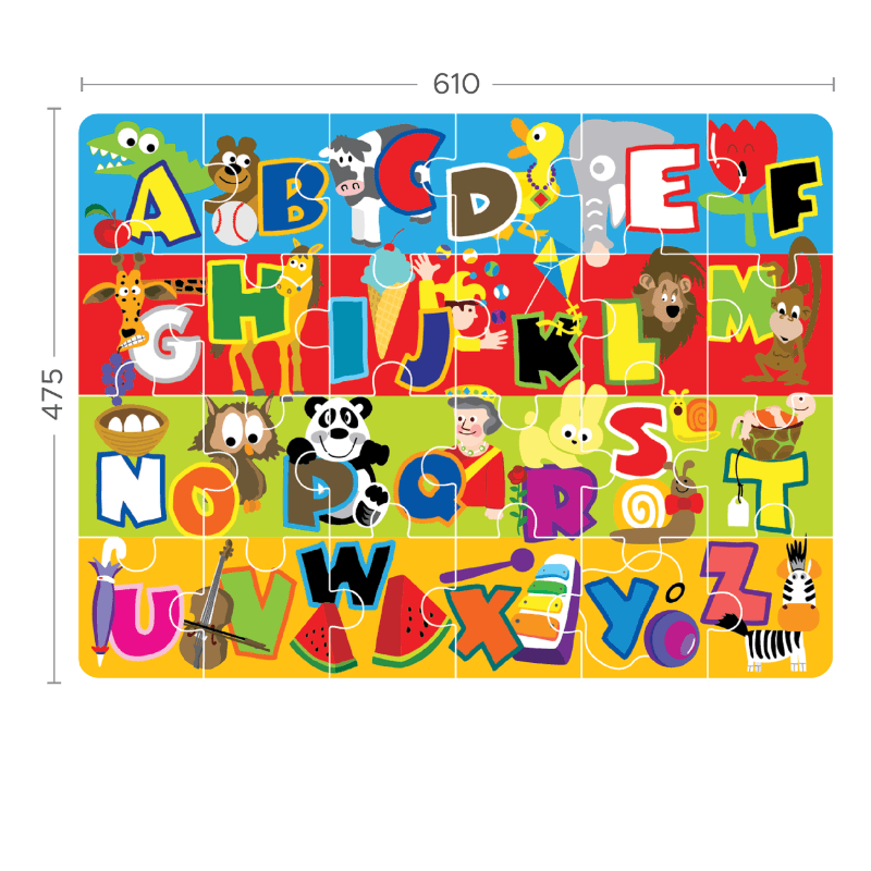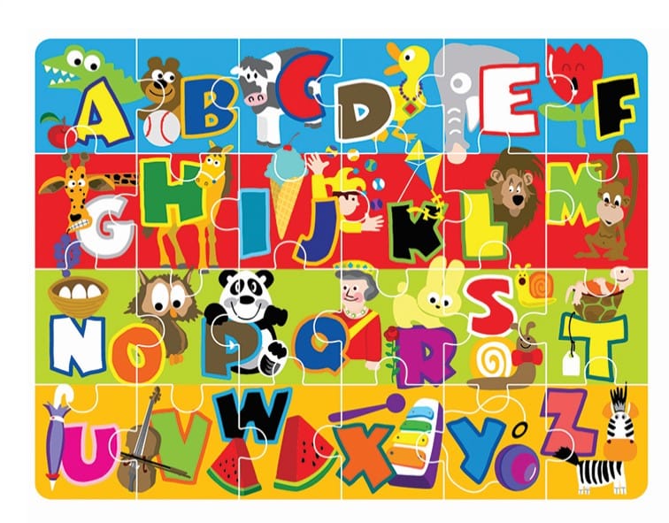 Setul include 24 de piese, fiecare reprezentand o litera a alfabetului, cu design colorat, prietenos si ilustrat cu animale, obiecte sau personaje ce incep cu litera respectiva: