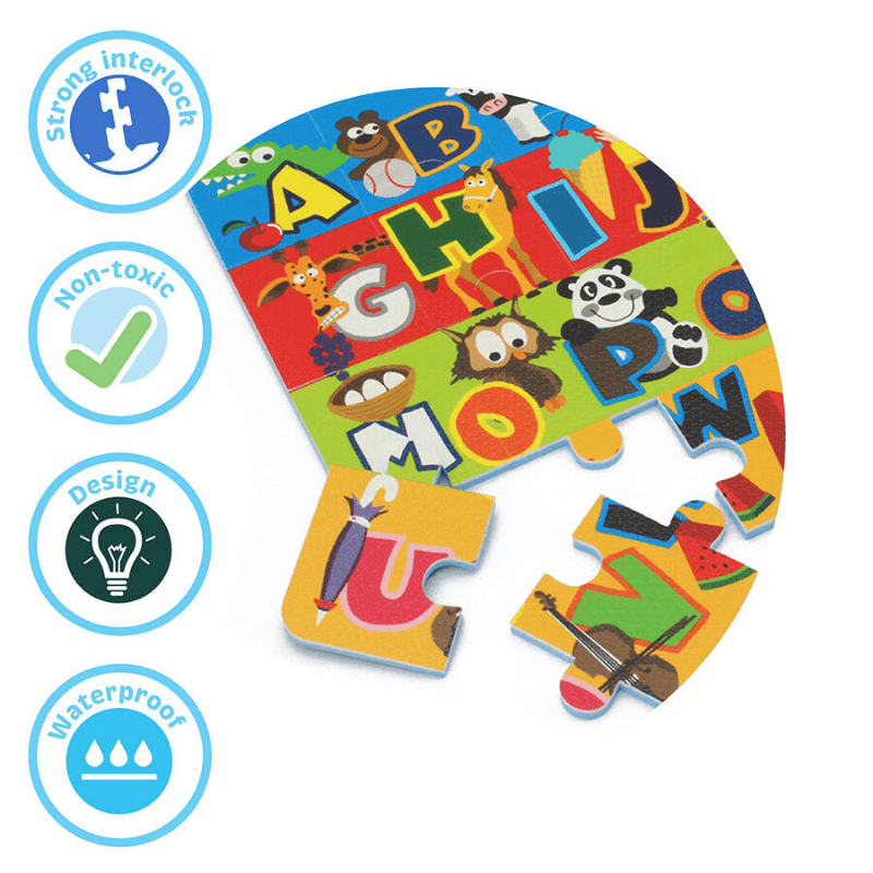 Puzzle-ul este realizat din spuma EVA (ethylene-vinyl acetate), un material recunoscut pentru proprietatile sale: