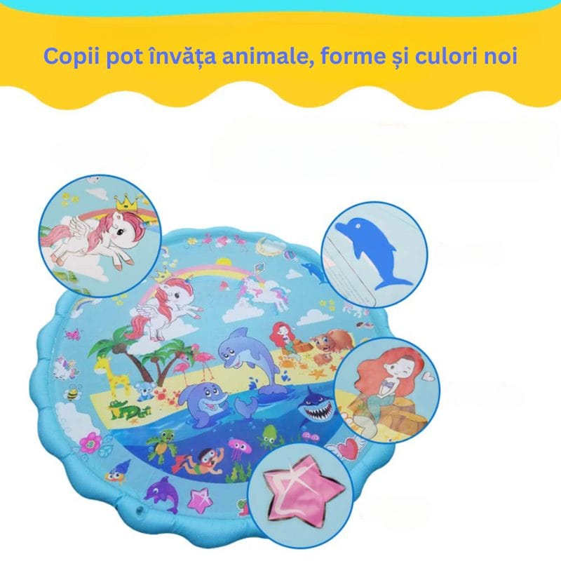 Fantana arteziana LUDIRO are un design adorabil, gandit special pentru a starni curiozitatea celor mici. Covorasul are un diametru generos de 170 cm si este decorat cu o lume marina si de poveste: