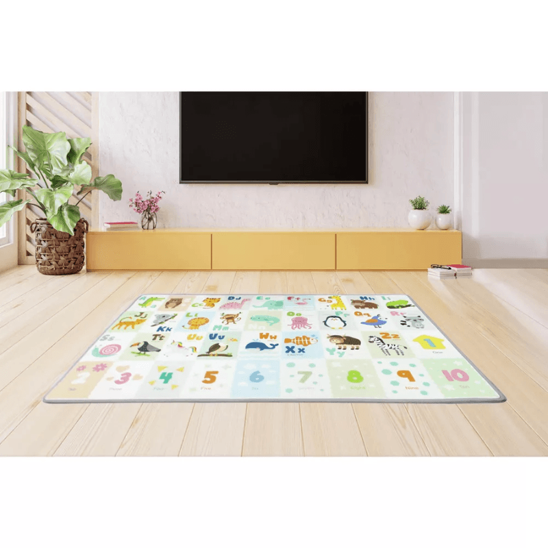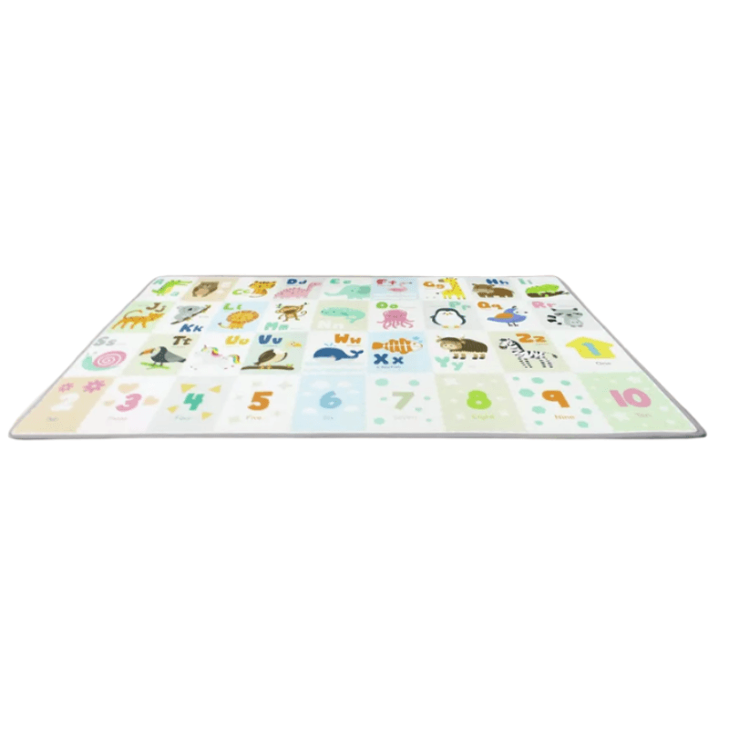 In partea inferioara, covorasul este decorat cu cifrele de la 1 la 10, insotite de reprezentarea lor in limba engleza („One”, „Two” etc.). Este o ocazie excelenta pentru parinti sa introduca primele notiuni de matematica in rutina zilnica de joaca.