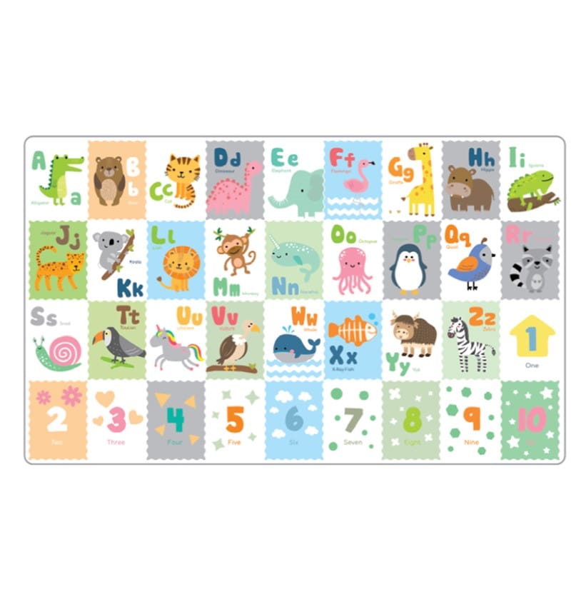Covorasul este imprimat cu toate literele alfabetului (A-Z), fiecare asociata cu un animal simpatic si colorat. Aceasta abordare vizuala ajuta copiii sa recunoasca mai usor literele si sunetele, asociindu-le intuitiv cu cuvinte cunoscute. De exemplu: