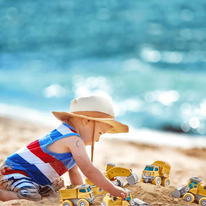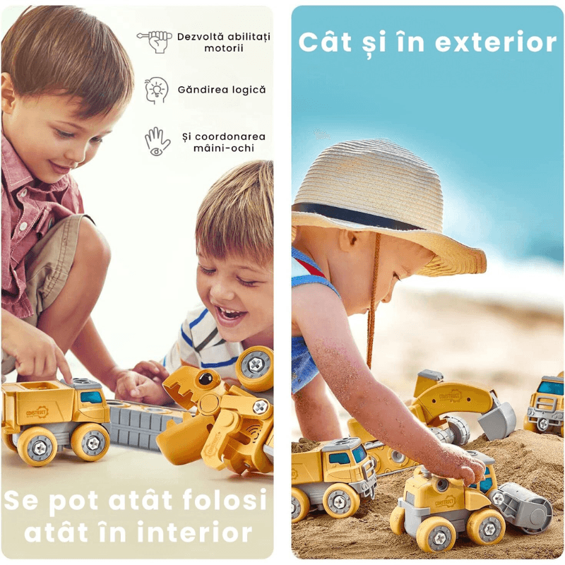 Asamblarea vehiculelor ii da copilului responsabilitatea de a construi singur. Descopera relatia forma-functiune: de ce o baza cu senile sustine un excavator si de ce betoniera are rostogolire.