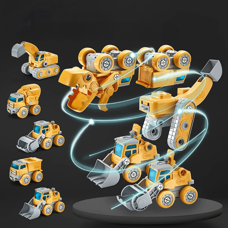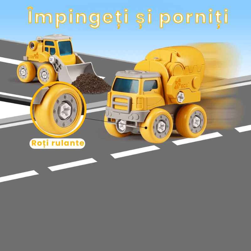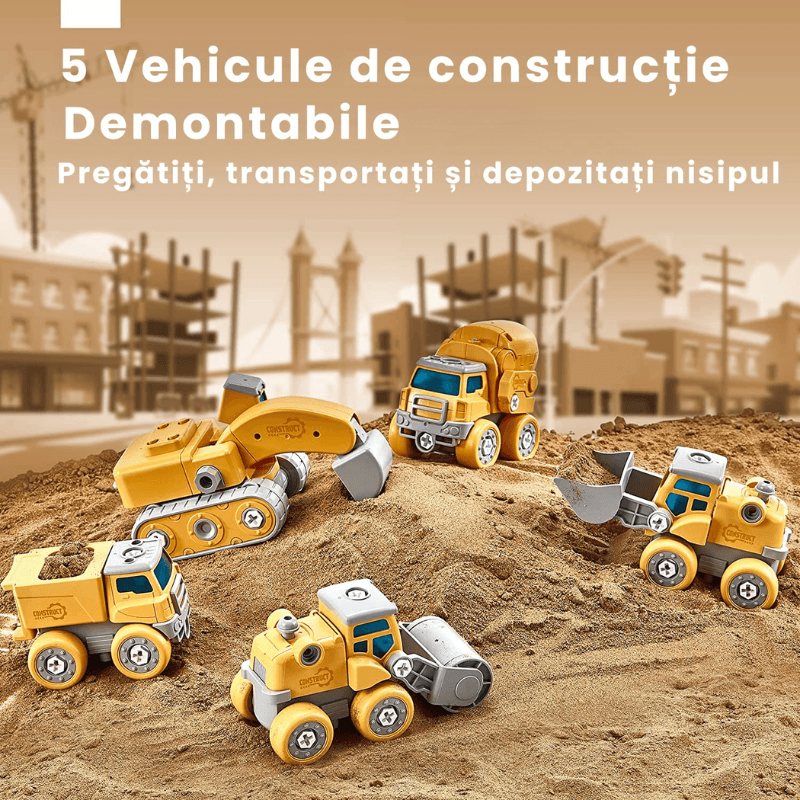 5 vehicule de constructii (excavator, buldozer, compactor, betoniera, basculanta), usor de asamblat cu surubelnita inclusa
