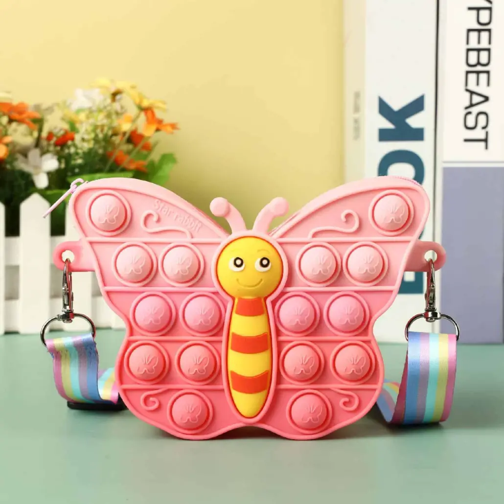 Descoperă revoluția jucăriilor antistres pentru copii: Geanta de umăr Pop‑It NOW de la LUDIRO, confecționată din silicon moale și rezistent, cu imprimeu fluturaș roz-roșu, curea ajustabilă și fermoar sigur. Conținutul bagajului este pus deoparte – în interior, găsim cea mai îndrăgită jucărie din ultimii ani, Pop‑It sensorial, integrată pentru joacă oriunde!