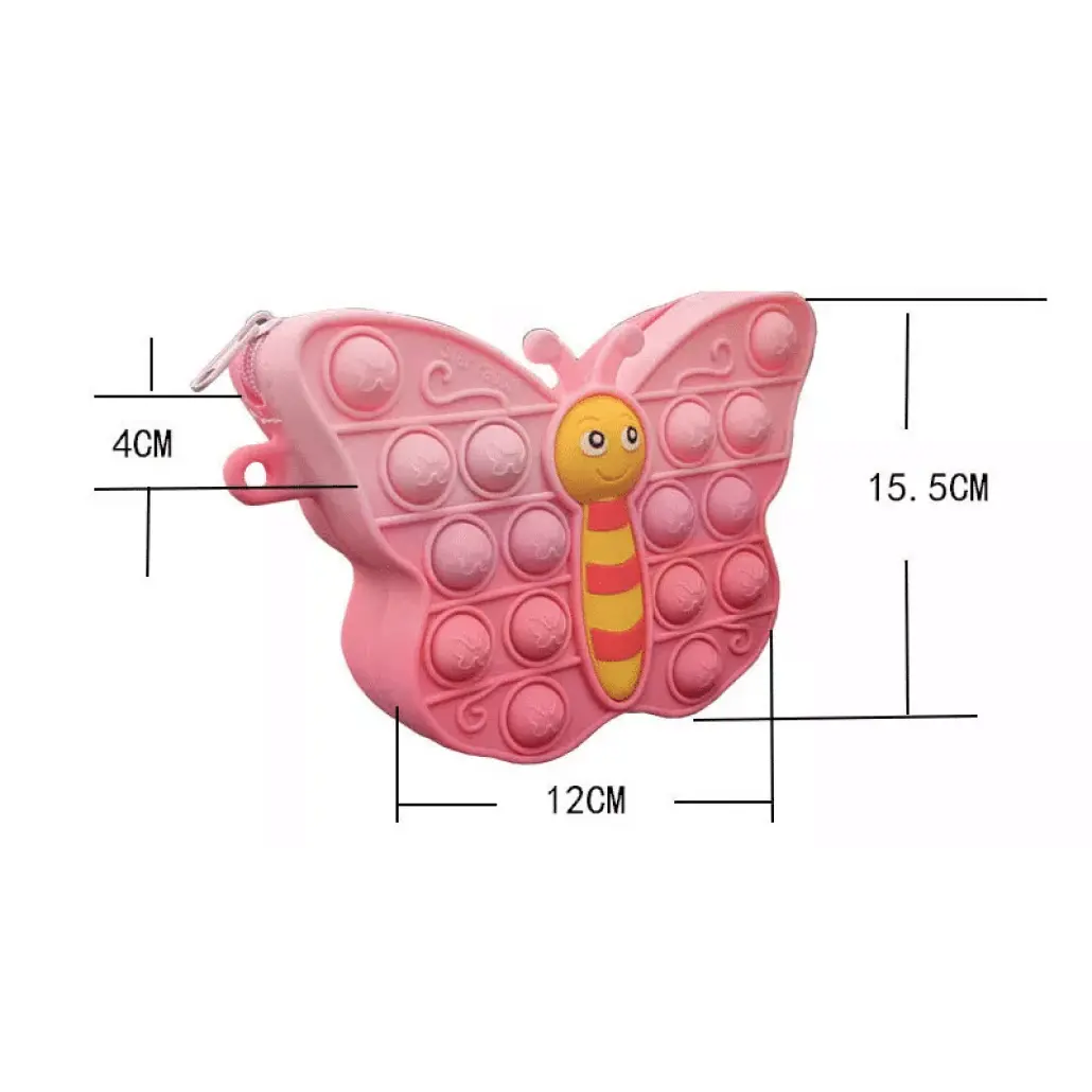 Geantă Pop‑It NOW LUDIRO din silicon, imprimeu fluturaș, fermoar și curea ajustabilă. Jucărie anti‑stres pentru copii 3+ ani, portabilă și distractivă!