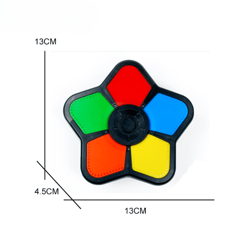 Forma de stea cu cinci brate, fiecare cu o culoare distincta (rosu, galben, verde, albastru si portocaliu), face jocul usor de inteles si placut vizual. Este proiectat ergonomic pentru mainile mici ale copiilor, iar dimensiunile sale reduse – 13 x 13 x 4.5 cm – il fac extrem de usor de transportat in geanta, rucsac sau valiza.