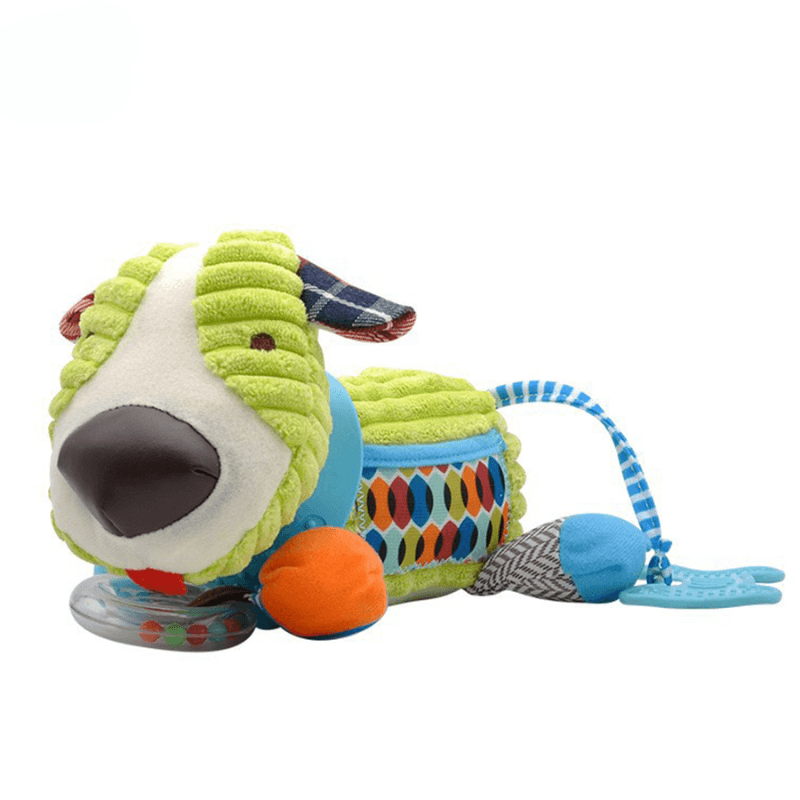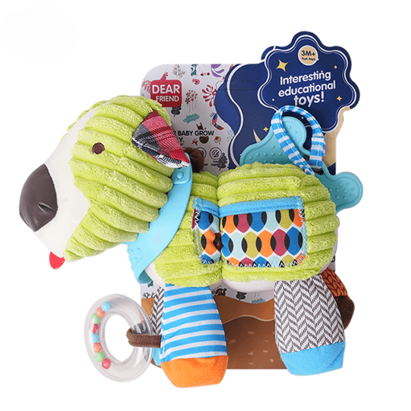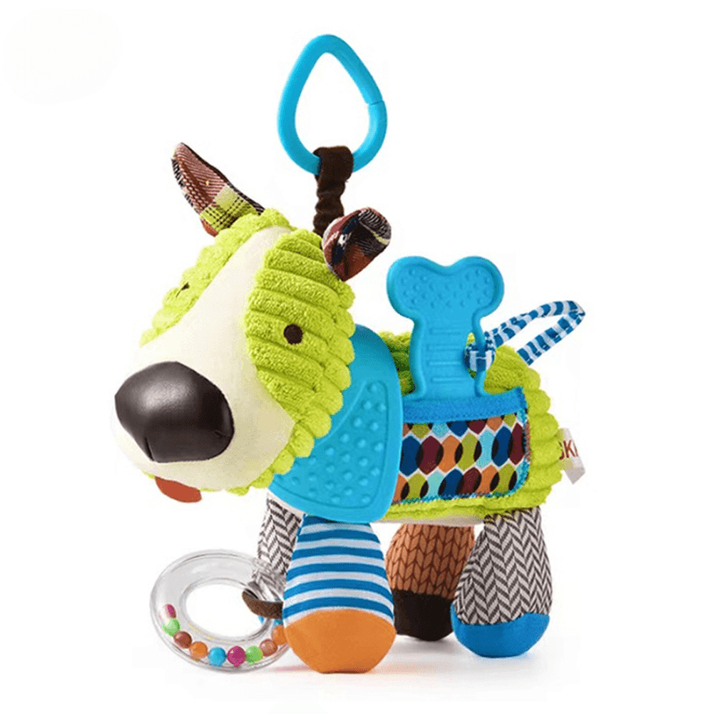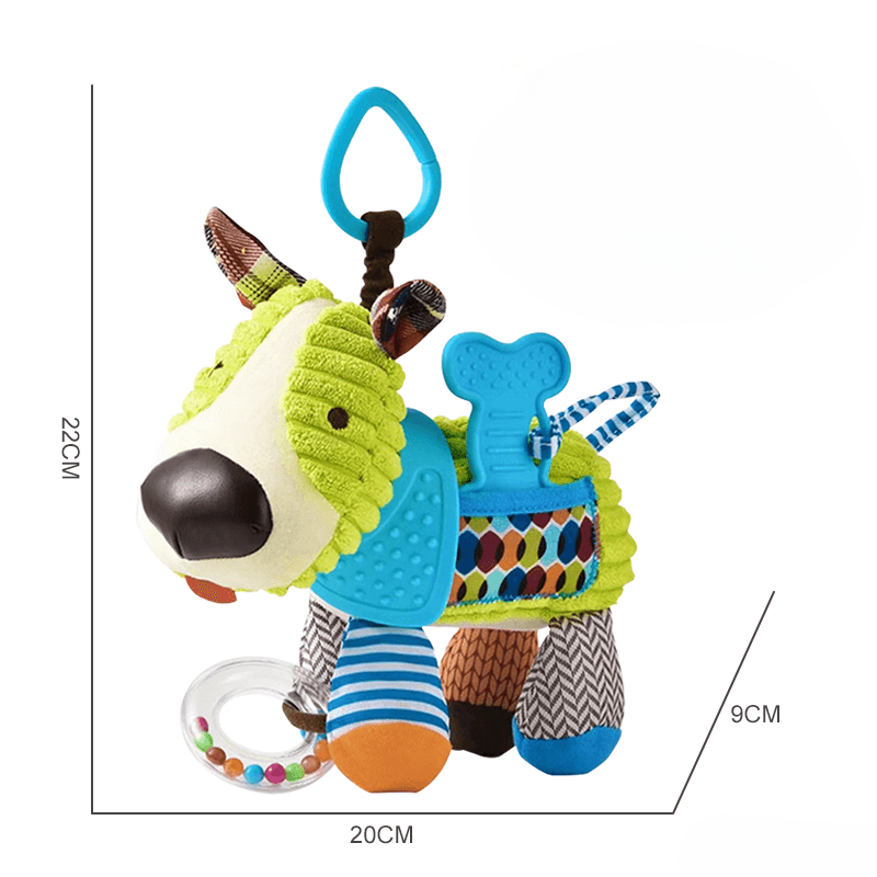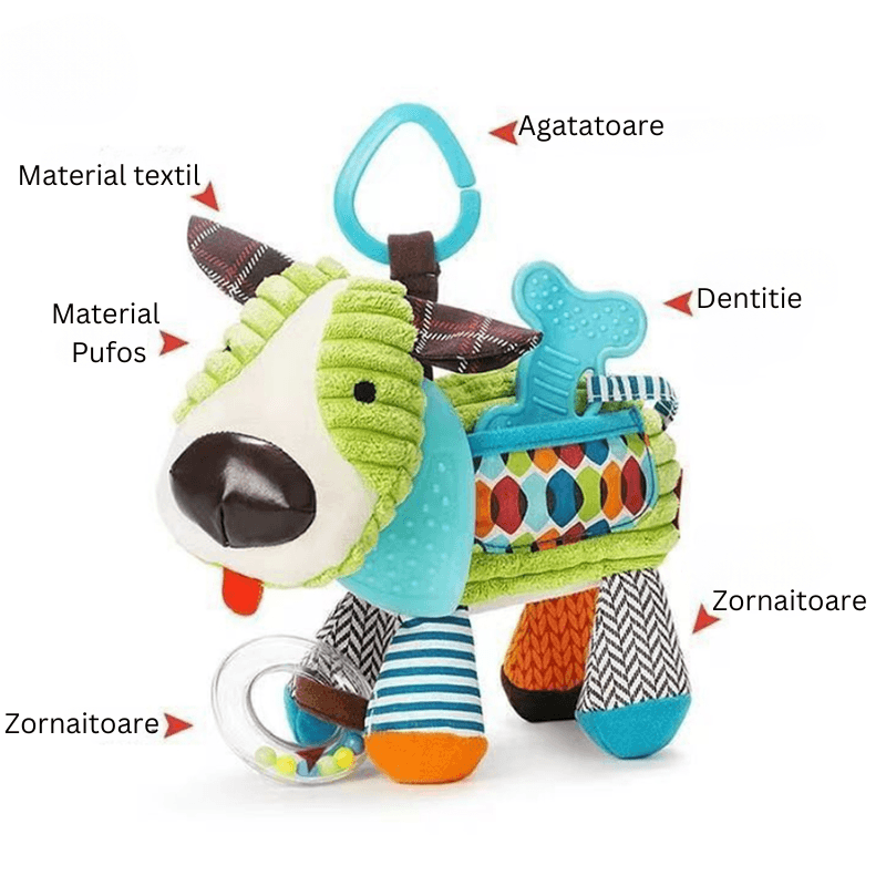 Are urechiuse fosnaitoare, doua zornaitori integrate si o jucarie de dentitie in forma de os, moale si usor de manuit. Toate aceste elemente ofera stimulare auditiva, tactila si orala, fiind esentiale in dezvoltarea coordonarii si a motricitatii fine.
