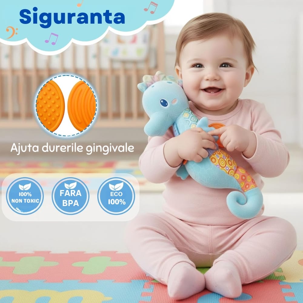 Căluțul de mare muzical este certificat și perfect sigur pentru a fi utilizat încă de la naștere (0+ luni).