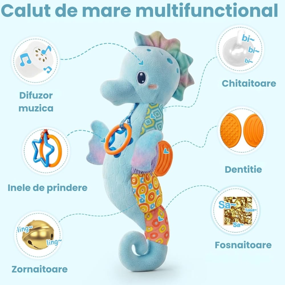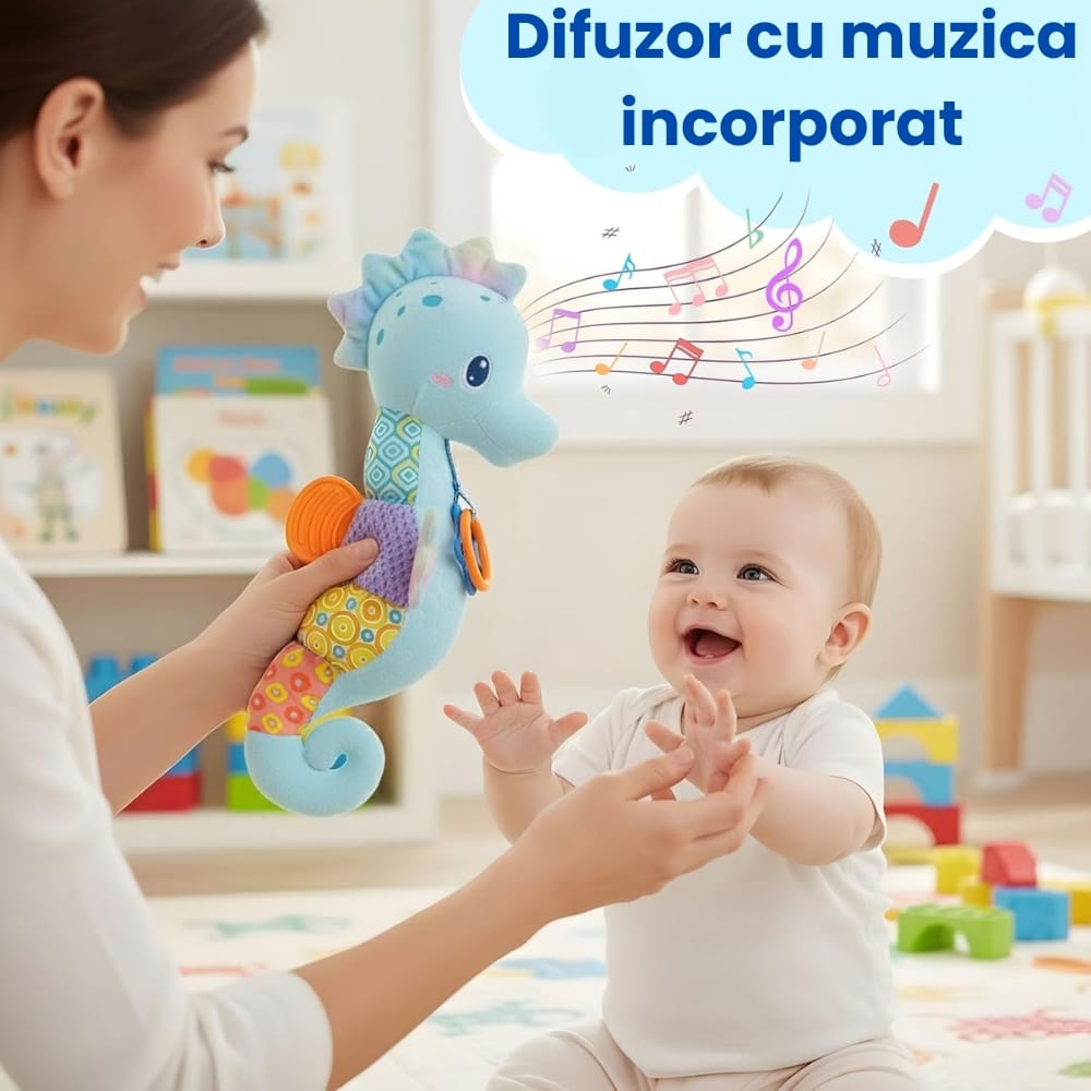 Adu magia oceanului în brațele puiului tău! Jucărie Bebeluși Căluțul de Mare Muzical și Senzorial este o jucărie complexă și extrem de moale, concepută pentru a liniști bebelușul și a-i stimula toate simțurile încă din prima zi de viață.