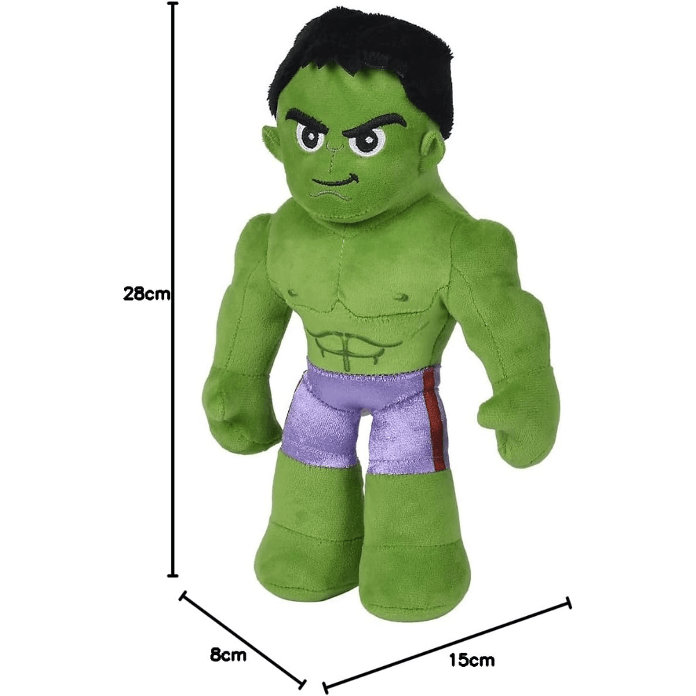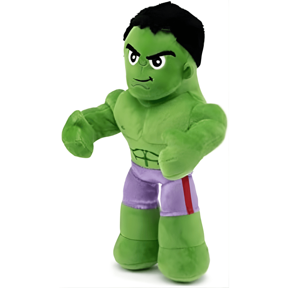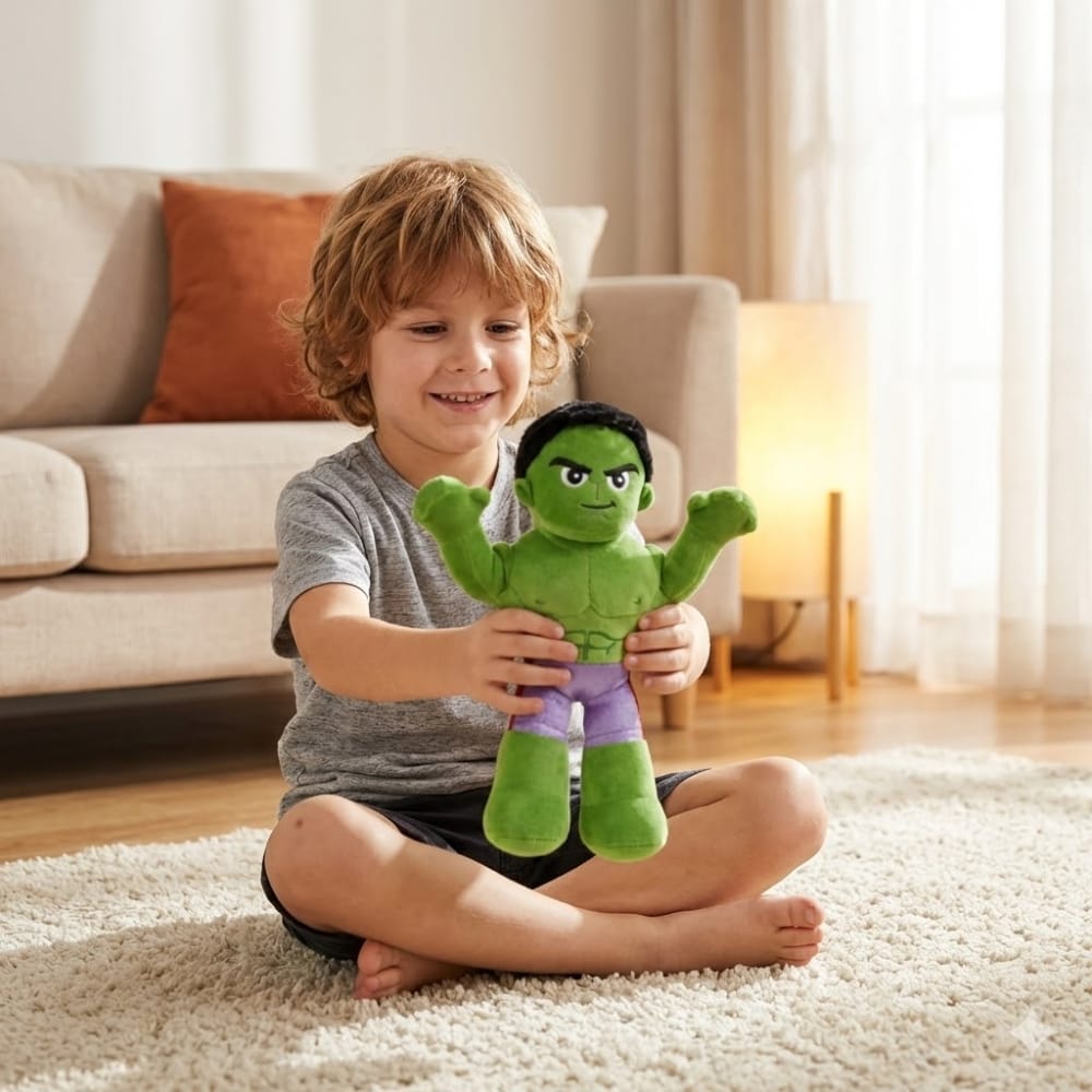 Design fidel și autentic: Respectă detaliile consacrate ale eroului Marvel, remarcându-se prin culoarea verde vibrantă, mușchii conturați din cusături și o expresie facială adaptată pentru a fi prietenoasă cu cei mici.