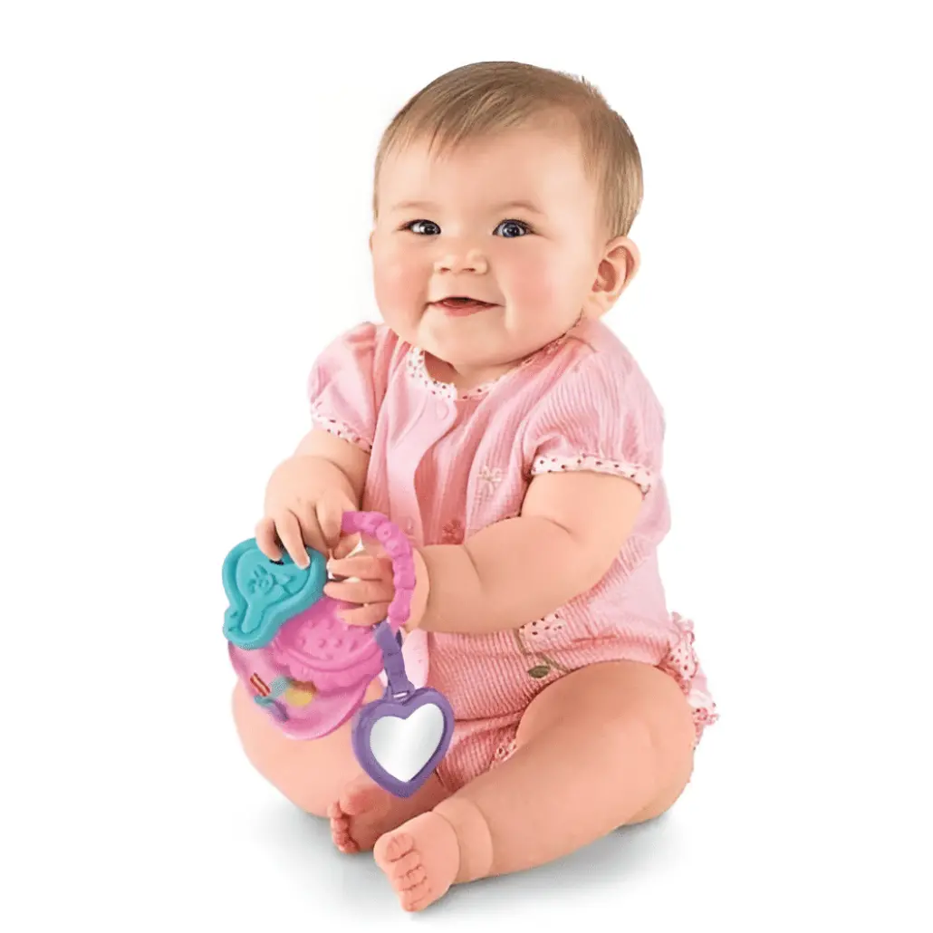 Primul tovarăș al bebelușului: gențuță Fisher-Price cu accesorii pentru dentiție – stimulează coordonarea, calmează gingiile și aduce zâmbete.