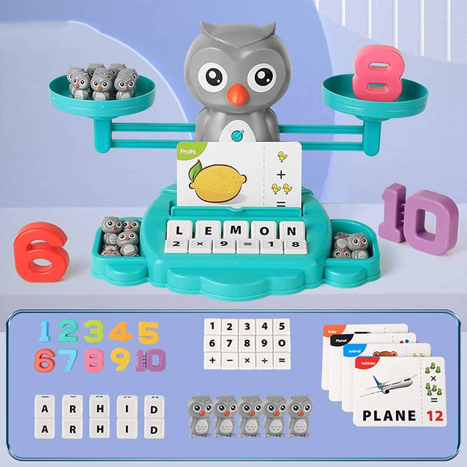 JUCARIE CADOU IDEAL PENTRU BAIETI SI FETE: Acest set de jucarie educative cu bufnite este un cadou perfect pentru copiii de 3, 4, 5 ,6 ani atat fete cat si baieti si include urmatoarele accesorii: 1 Soldul broscutei, 1 tava asortata, 2 tavi de cantarire, scale detasabile 32 de carti cu imagini cu doua fete, 10 greutati cu numere colorate 19 greutati pentru maimute mici de jucarie, 10 cuburi de litere( sunt incluse 26 de litere de la A la Z), 20 de numere blocuri si 5 blocuri cu simboluri matematice impreuna cu ghidul de joc.