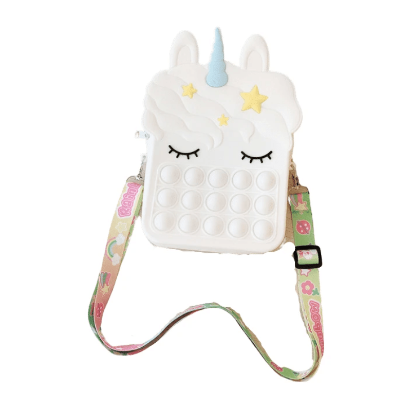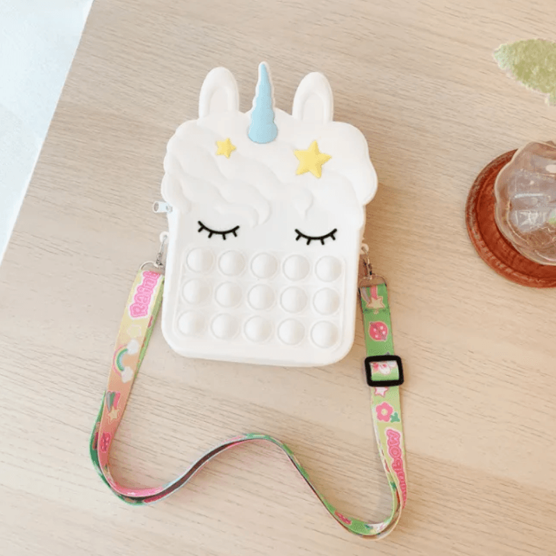 Descoperă noua Jucărie interactivă antistres Pop It tip geantă de umăr unicorn, model pătrat XXL (16 × 22.5 × 5.5 cm, alb) – un accesoriu vizual adorabil și o unealtă senzorială ideală pentru reducerea stresului, anxietății și dezvoltarea motricității tactile la copii și adulți. Fabricată din silicon moale, impermeabil, durabil și reutilizabil, această geantă-combo combină funcția utilă de genţă cross‑body cu jocul Pop It distractiv al bulelor tactile.