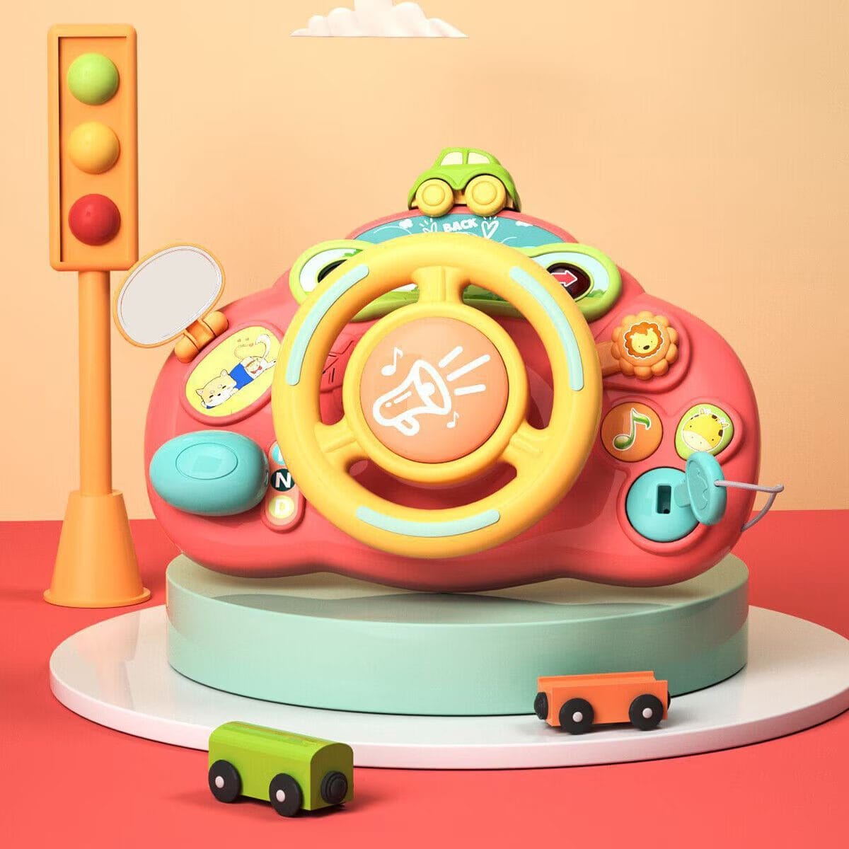 Volan rotativ – cu claxon central, activat prin apăsare, emite sunete realist‑muzicale inspirate de vehicule, stimulând motricitatea și coerența acțiunii