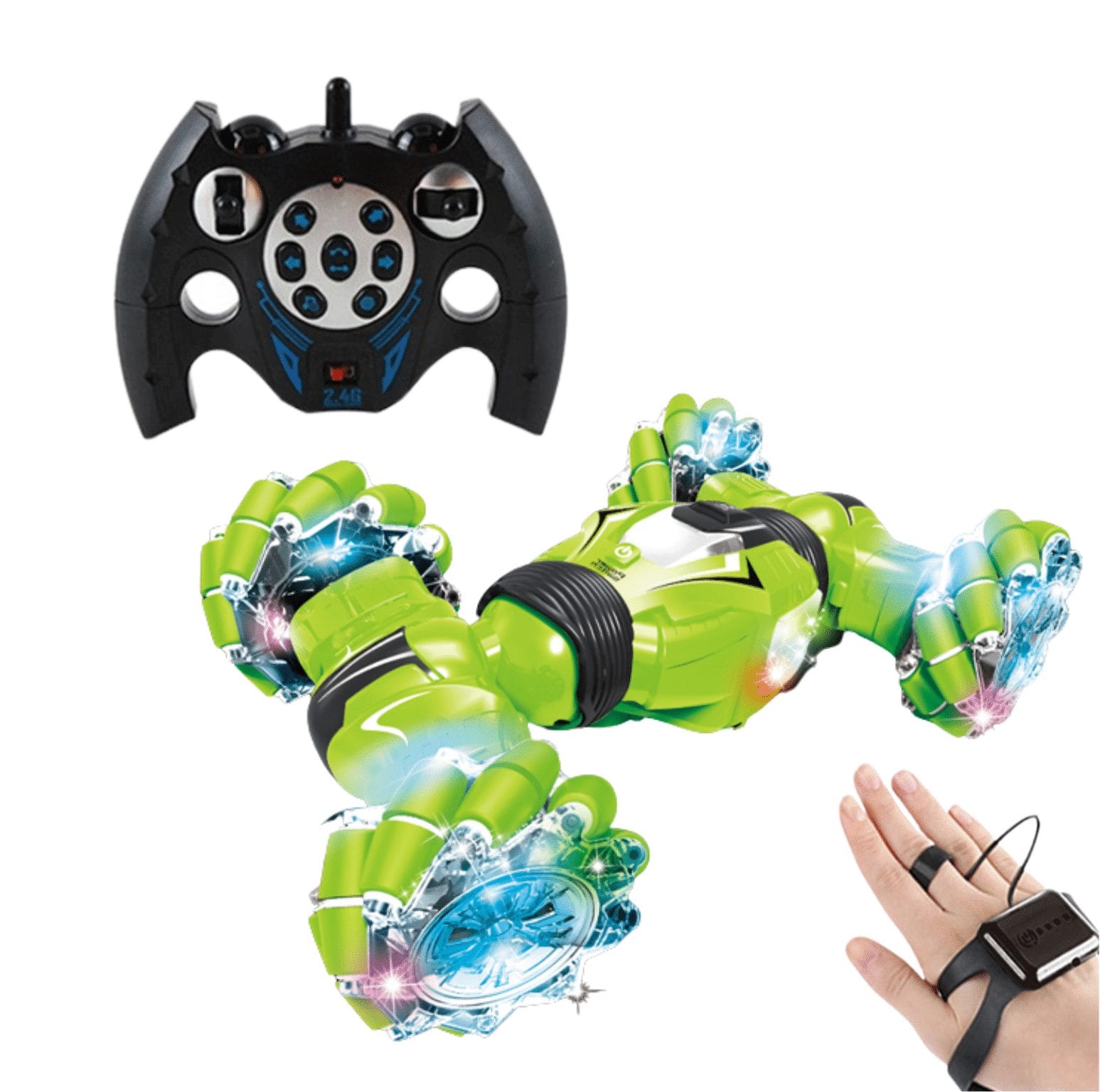 Telecomanda cu senzor de gesturi: Pe langa telecomanda obisnuita, aceasta masina RC este echipata si cu un ceas cu control prin gesturi. Misca-ti bratul sau rasuciti incheietura mainii, puteti folosi aceste gesturi pentru a controla masina prin intermediul acestui ceas. Noul mod de control va va aduce cu siguranta o experienta fara precedent.