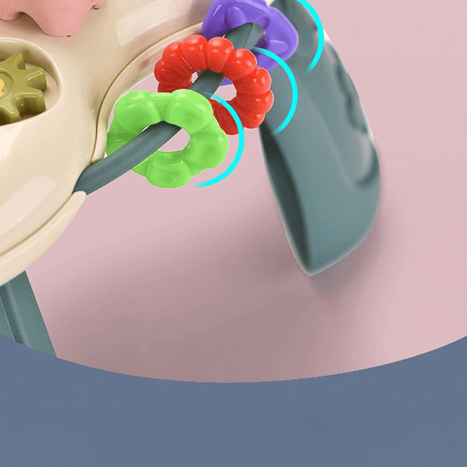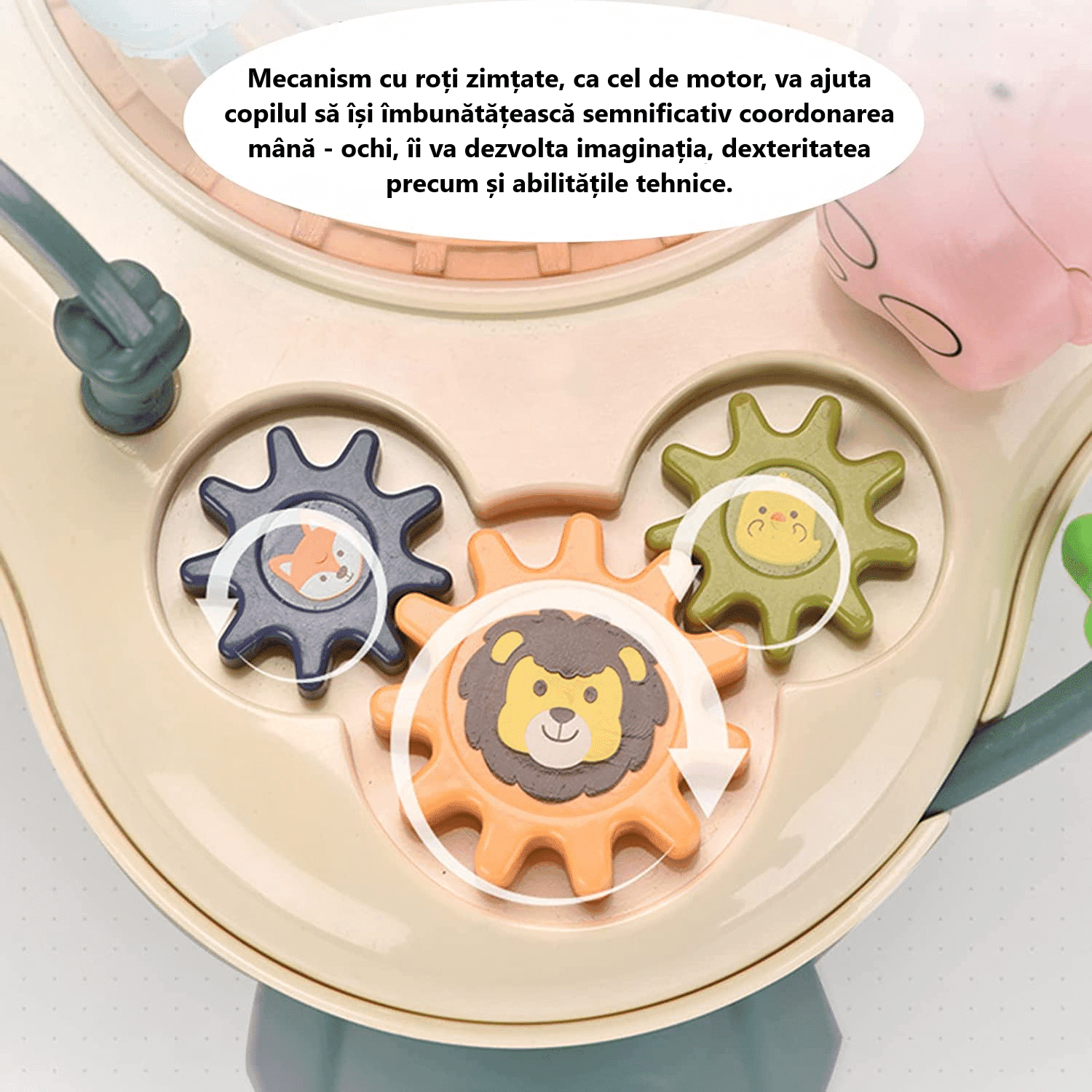 Prin intermediul unor rotite dintate rotative copilul isi poate imbunatati capacitatea de coordonare mana-ochi, isi poate dezvolta imaginatia si concentrarea.