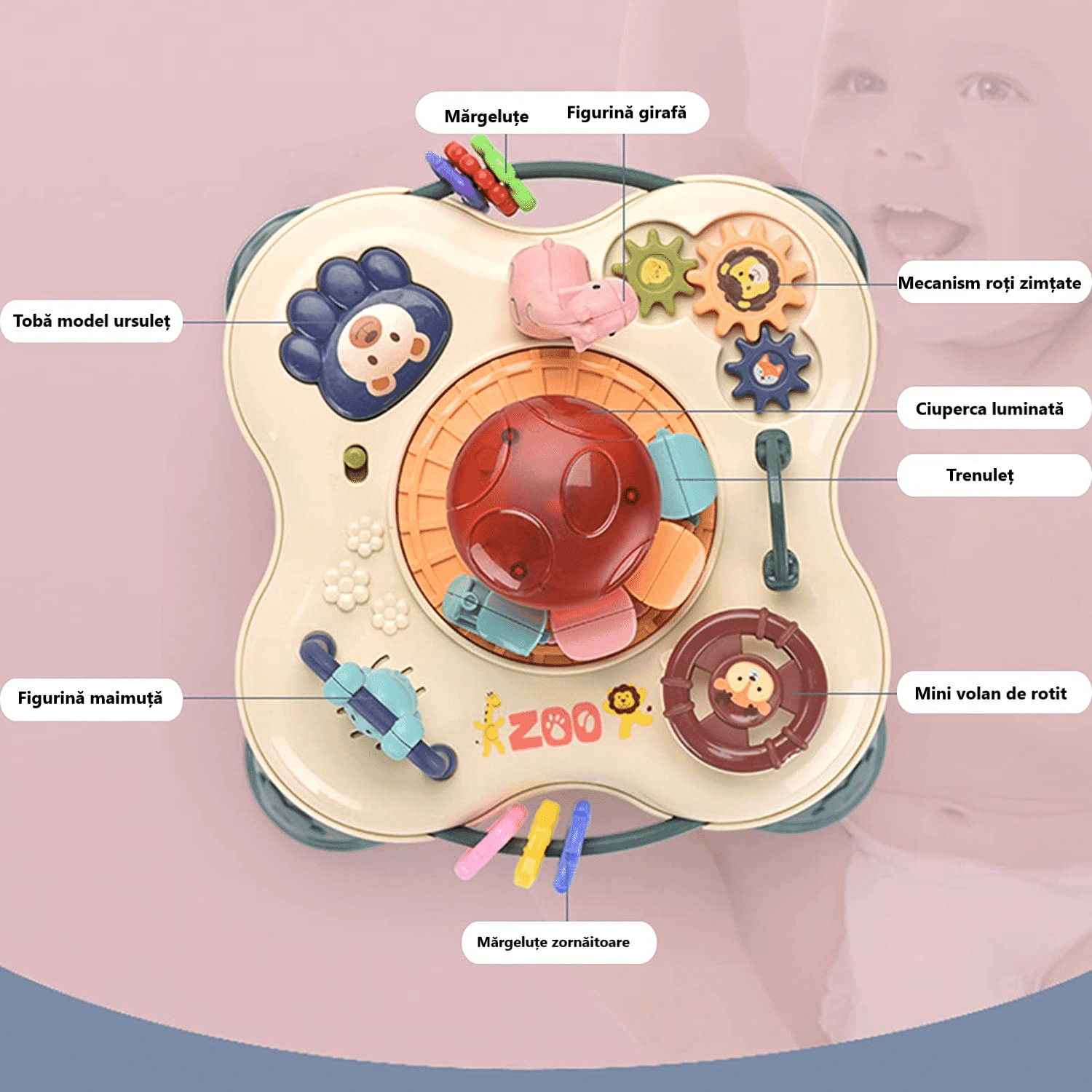 1 recenzie pentru Mini Masuta Interactiva Educativa pentru Bebelusi, Parcul Zoologic, Lumini si Sunete, Activitati Multiple, 18x18x18 Cm, + 18 Luni