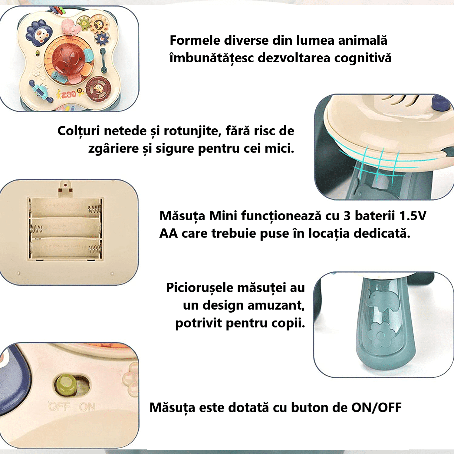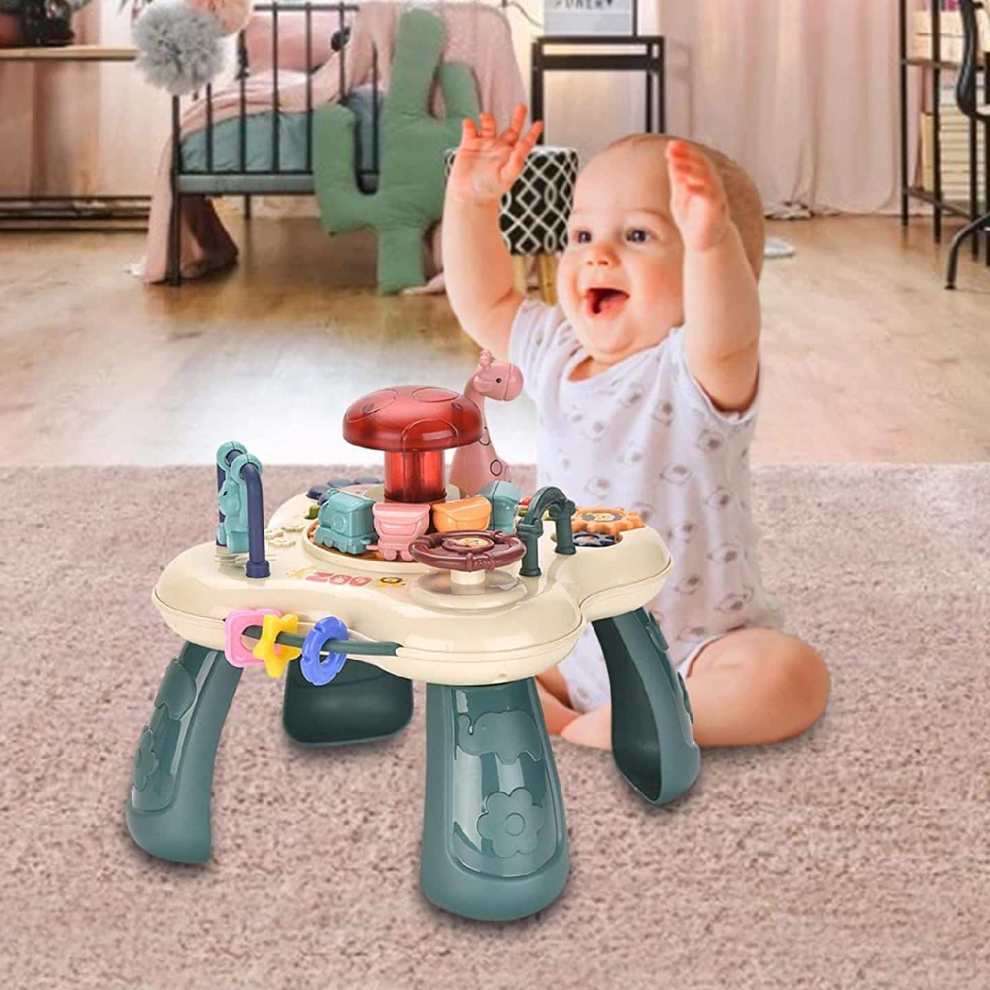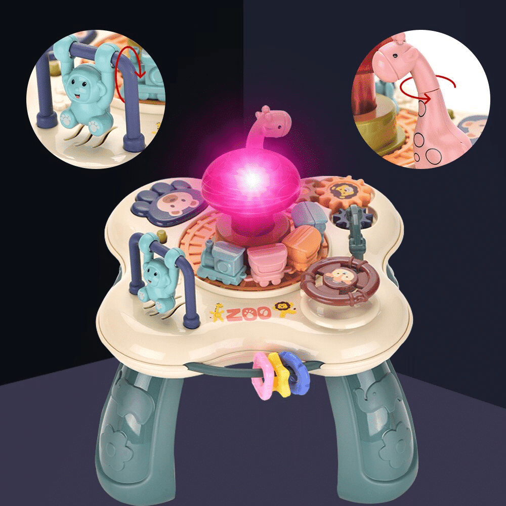 Masuta interactiva are diverse modalitati interesante de joaca, ajuta la dezvoltarea bebelusului, imbunatateste capacitatea de coordonare mana-ochi si intareste dezvoltarea senzoriala, ajuta copilul sa creasca fericit prin joaca.