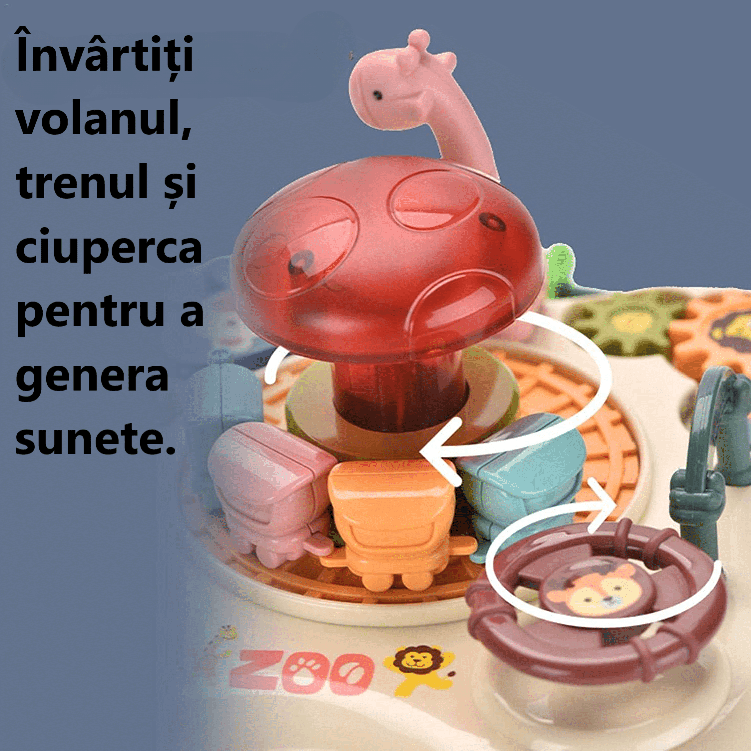 Pe masura ce rotiti volanul, trenul si ciuperca se rotesc de asemenea: locomotiva conduce trei vagoane de-a lungul sinei in jurul ciupercii, iar aceasta se roteste in directia opusa trenului.