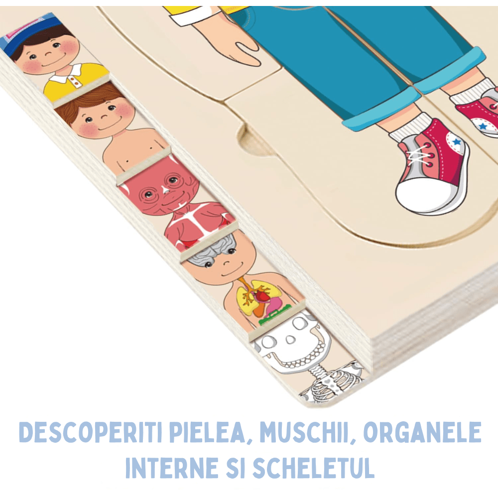 🧬 5 straturi, o lecție completă de anatomie — Copilul explorează corpul uman pas cu pas: haine → piele → mușchi → organe interne → schelet. Fiecare nivel dezvăluie un nou sistem al corpului, iar la final totul se reasamblează de la zero.