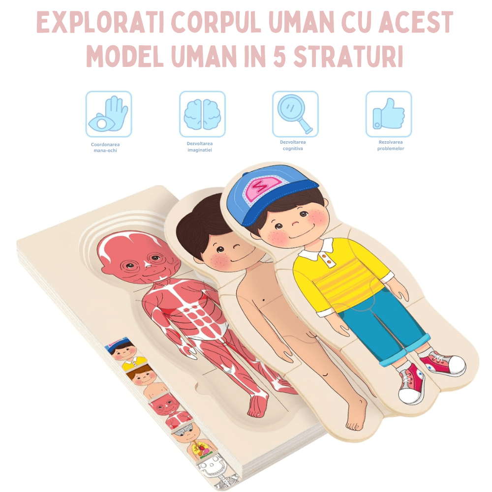 🧠 Dezvoltare completă — Coordonare mână-ochi, motricitate fină, gândire logică, vocabular anatomic și curiozitate pentru știință. Material didactic Montessori ideal.