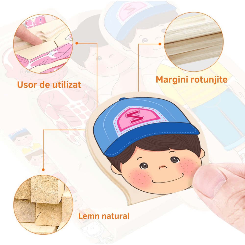 Toate piesele sunt realizate din lemn natural gros, fără BPA, cu ilustrații detaliate și prietenoase. Marginile sunt rotunjite cu grijă, fără așchii sau colțuri ascuțite. Vopseaua este pe bază de apă, netoxică și rezistentă la atingere repetată.