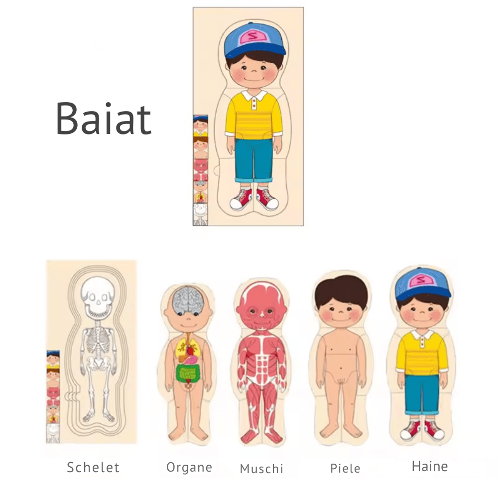 Un cadou educativ pentru copii de la 3 ani în sus — acasă, la grădiniță sau ca material didactic Montessori. Se pretează și pentru școală primară, ca suport vizual în primele lecții de biologie. Disponibil și în varianta Fetița.