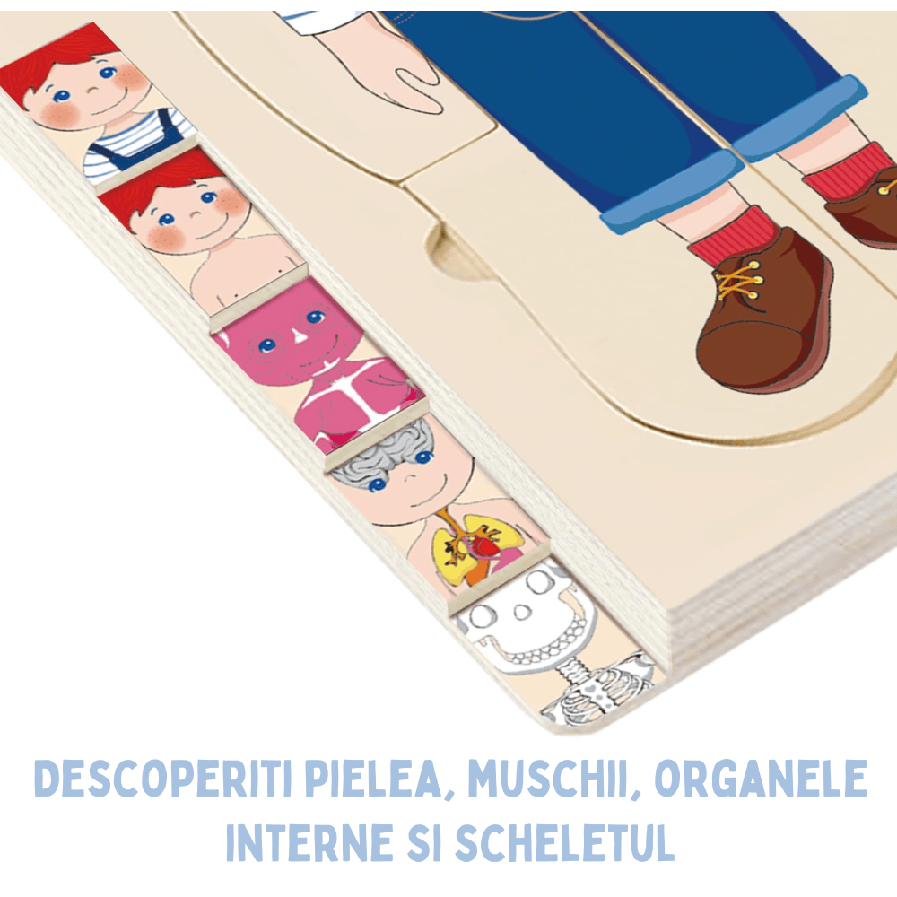 Puzzle-ul nu este doar un exercițiu de motricitate fină — este o primă lecție de biologie. Copilul învață unde sunt plămânii, ce formă au oasele, cum arată mușchii și cum se leagă totul într-un întreg. Vocabularul anatomic vine natural, prin joacă repetată, fără presiune.