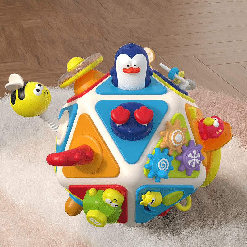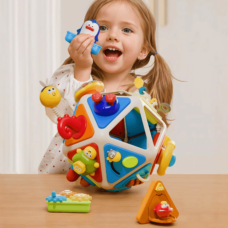 Datorita formei sale icosaedrice (cu 20 de fete), copilul poate interactiona cu jucaria din orice unghi. Nu exista fata „corecta” sau „gresita” – fiecare parte a jucariei este interesanta, contribuind la invatarea libera si nestructurata, exact ce au nevoie cei mici in aceasta etapa.