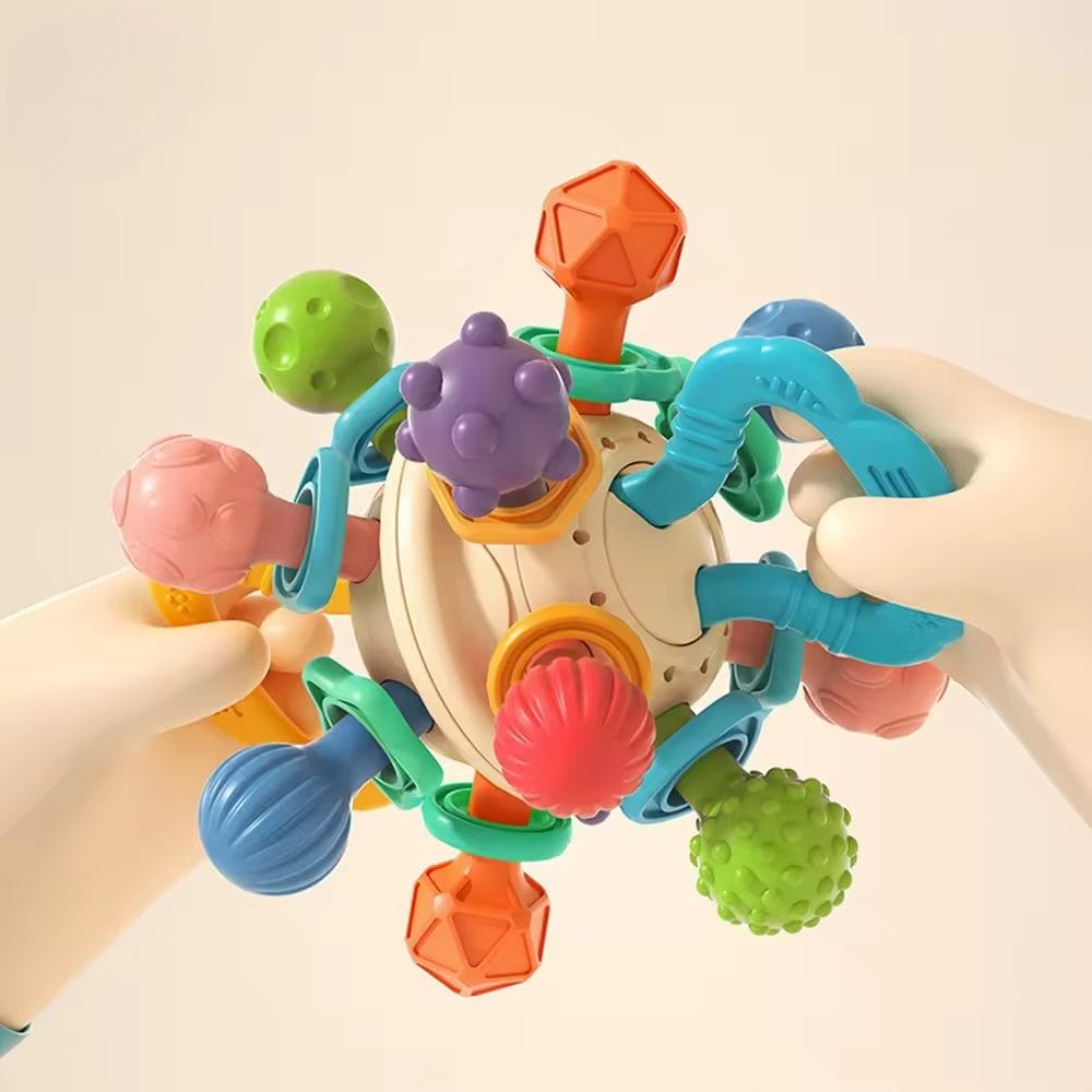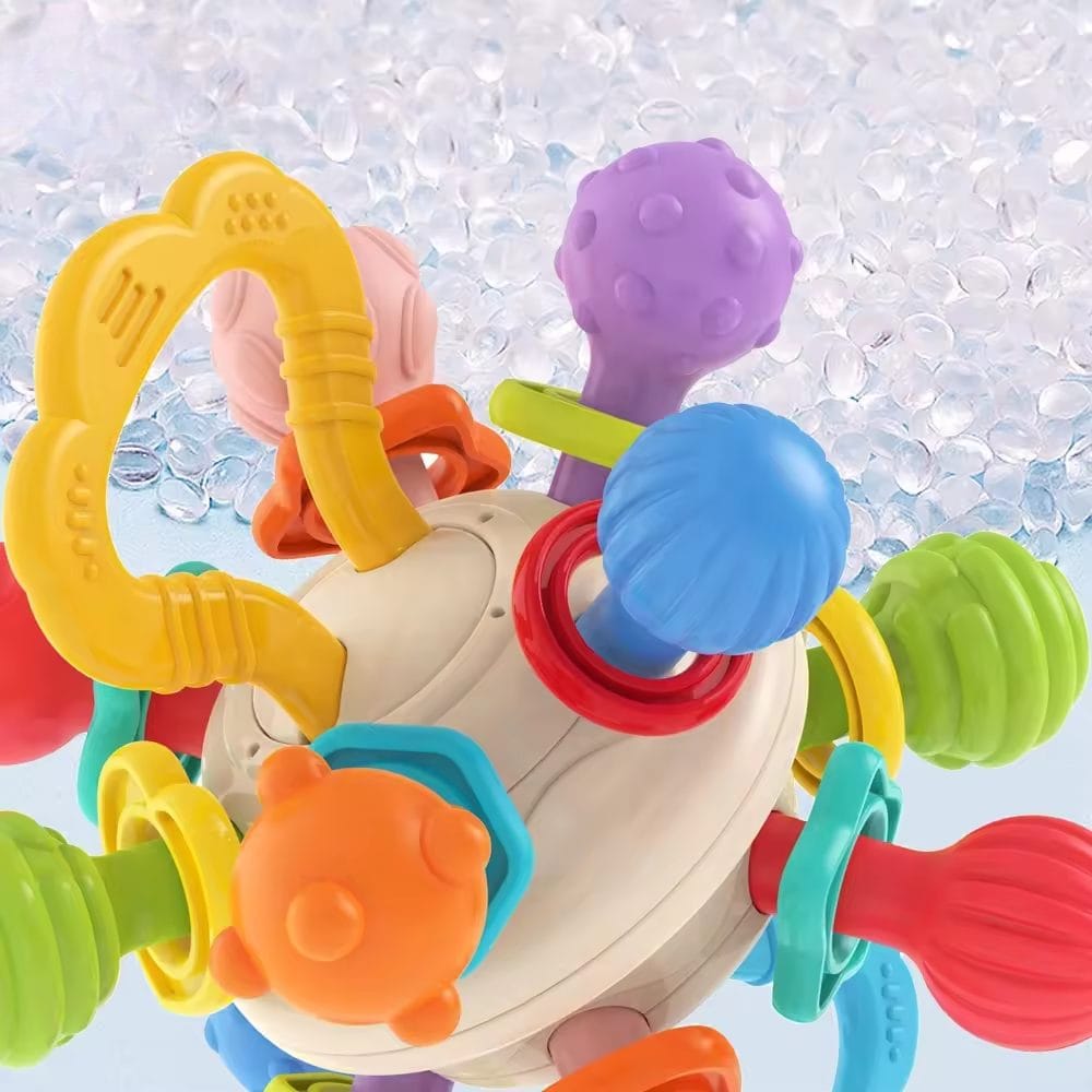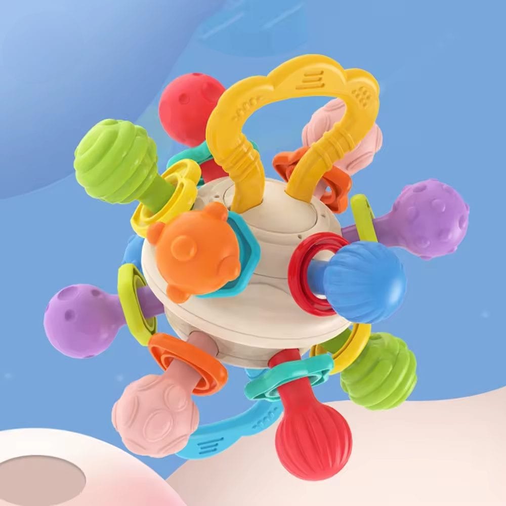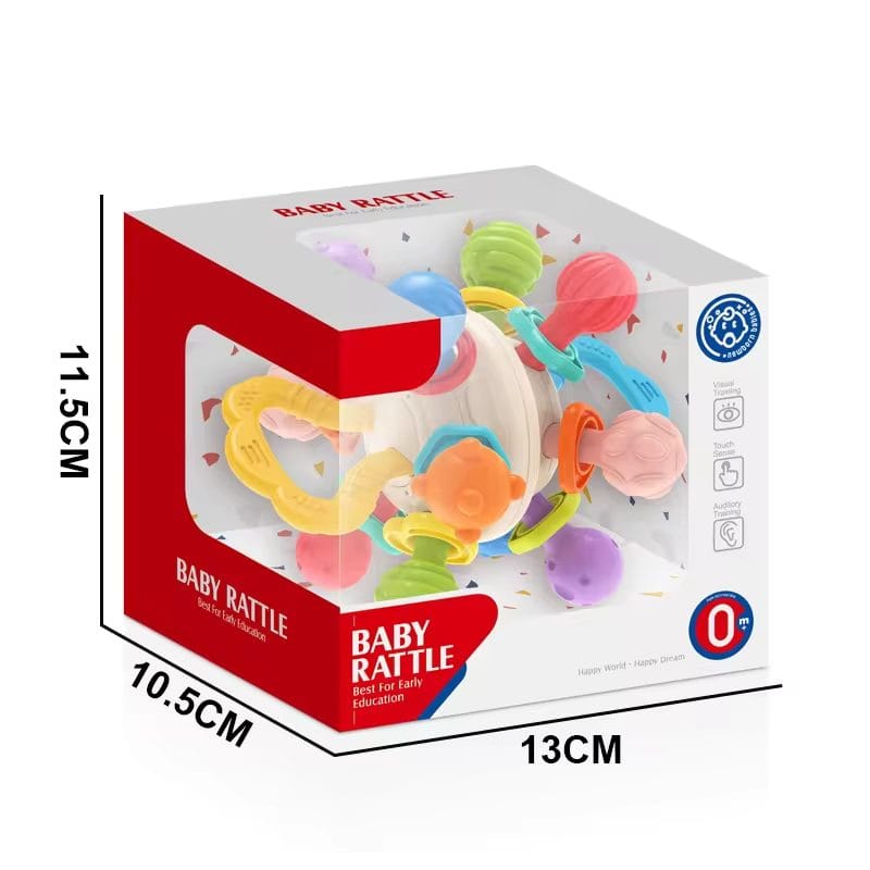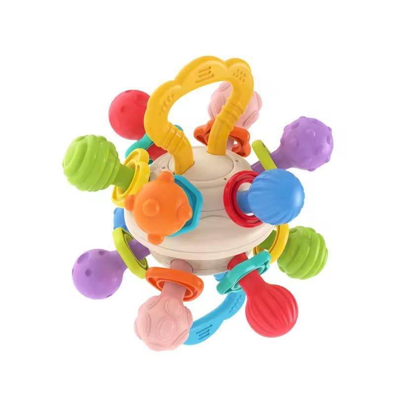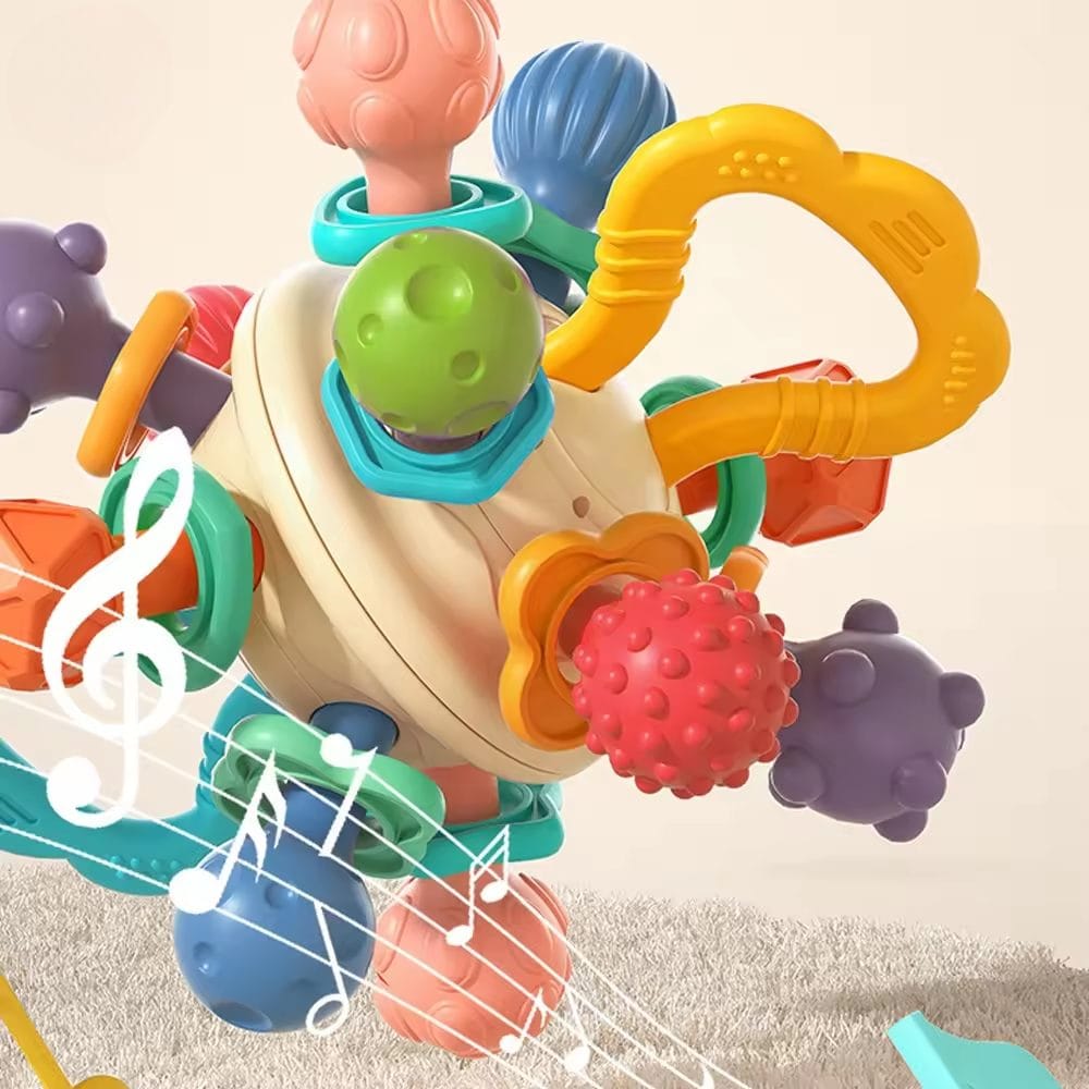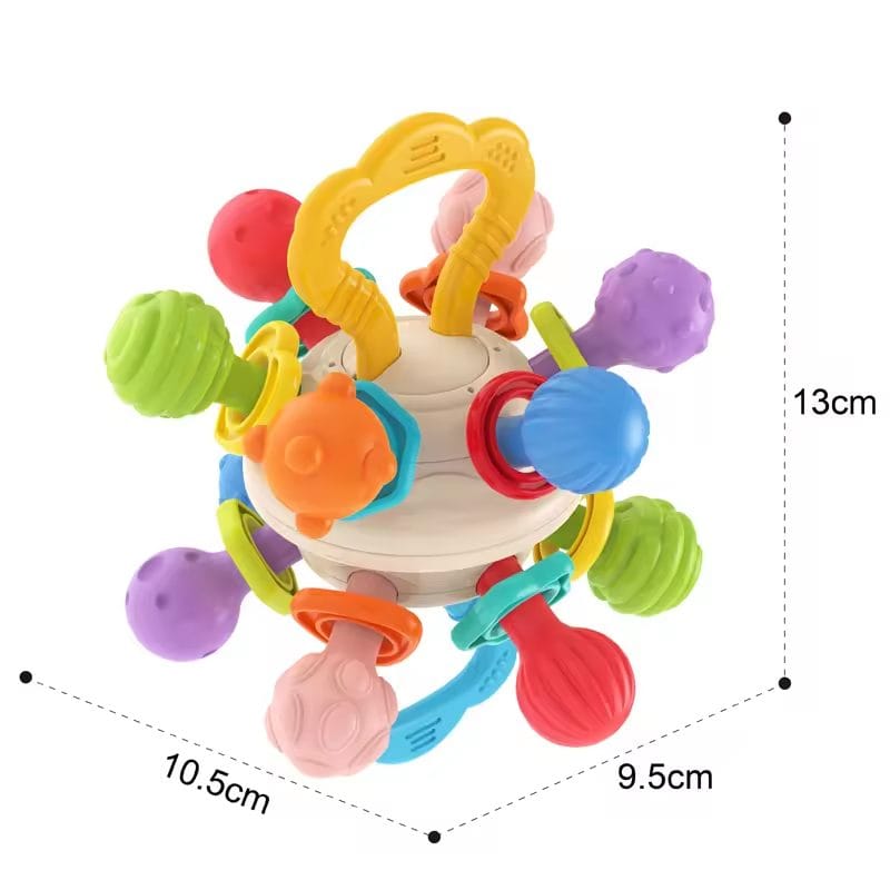 Dezvoltare motorie: Diversele forme si texturi ale mingii ajuta la dezvoltarea coordonarii maini-ochi si a abilitatilor motorii fine. Bebelusii vor invata sa prinda, sa stranga si sa roteasca segmentele jucariei, imbunatatindu-si astfel dexteritatea.