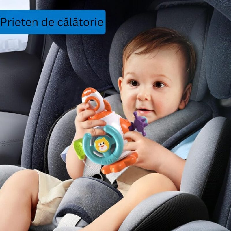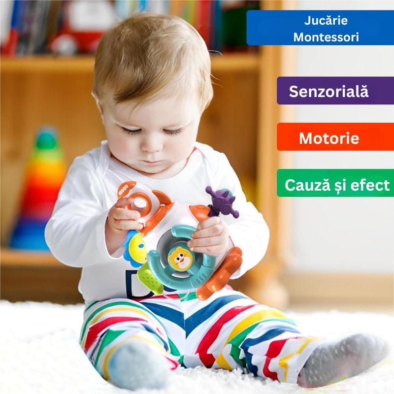 Design Atragator si Culori Vii: Jucaria este special conceputa pentru a atrage atentia celor mici prin culorile sale vibrante si elementele interactive. Fiecare parte a jucariei este gandita pentru a oferi o experienta tactila si vizuala bogata, mentinand copilul implicat si curios.