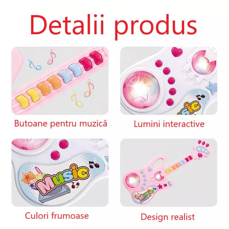 Jucăria chitară electrică are diferite moduri de joc, cu numeroase sunete muzicale și lumini puternice, plus butoane ușor de apăsat concepute special pentru mainile mici ale copiilor. Are multiple functii: