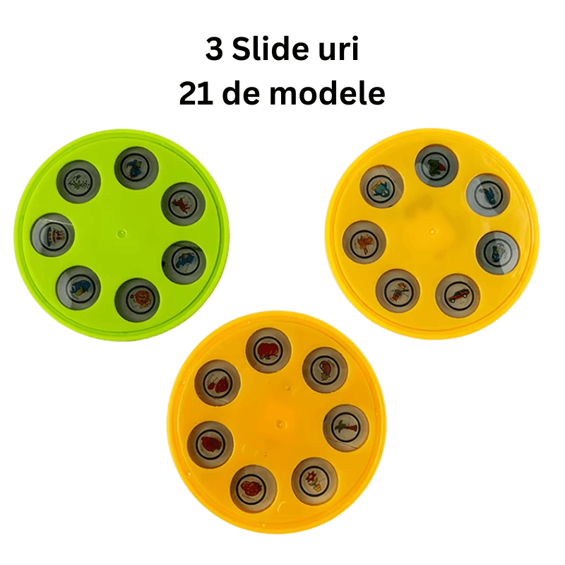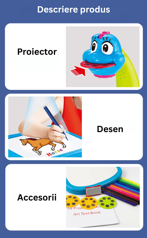 Setul include 3 discuri colorate, fiecare cu cate 7 imagini tematice precum animale, fructe, vehicule si dinozauri simpatici. Copilul poate alege ce doreste sa deseneze, iar proiectorul LED va afisa imaginea clar, direct pe plansa de lucru.