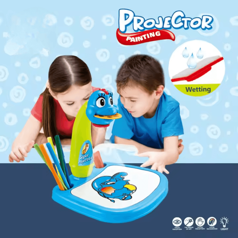 Resigilat - Masa de Desen cu Proiector pentru Copii, 3 Discuri, 21 Imagini, 12 Carioci Colorate, Dino Albastru