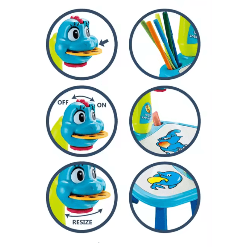 Home Resigilate Resigilat – Masa de Desen cu Proiector pentru Copii, 3 Discuri, 21 Imagini, 12 Carioci Colorate, Dino Albastru