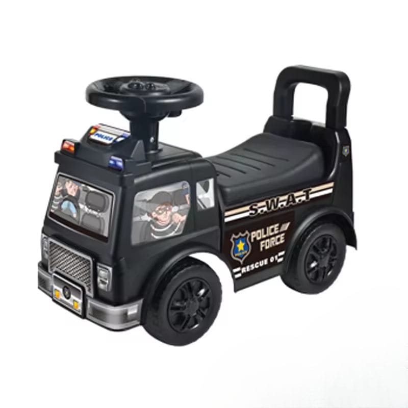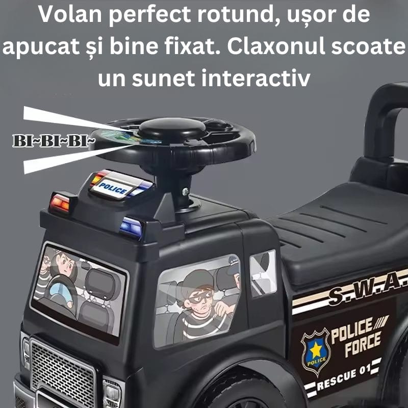 Masinuta ride-on politie ofera o experienta palpitanta pentru tinerii aventurieri care viseaza sa fie eroi. Aceasta masinuta este proiectata sa arate ca un vehicul SWAT, complet cu politisti animati si criminali reprezentati pe ferestre.
