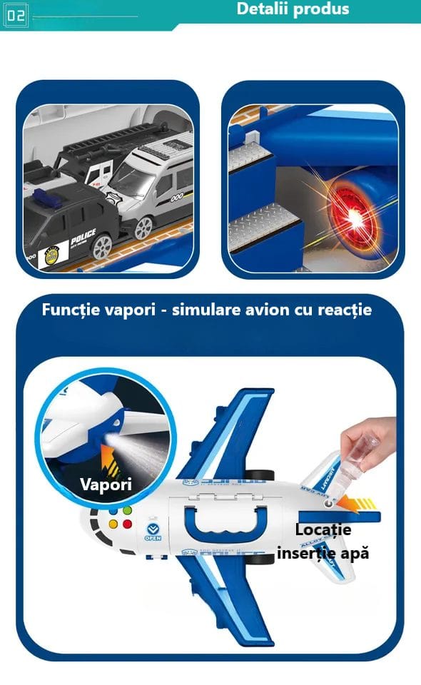 Avionul are o trapa care se poate deschide, iar in interior contine un spatiu mare pentru depozitare, unde cele 3 masinute incap fara probleme. De asemenea, se deschide lateral pentru a facilita manevrarea jucariilor din interior.