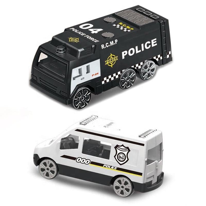 Include 3 masinute metalice ale fortelor de politie si un set de 7 indicatoare rutiere.