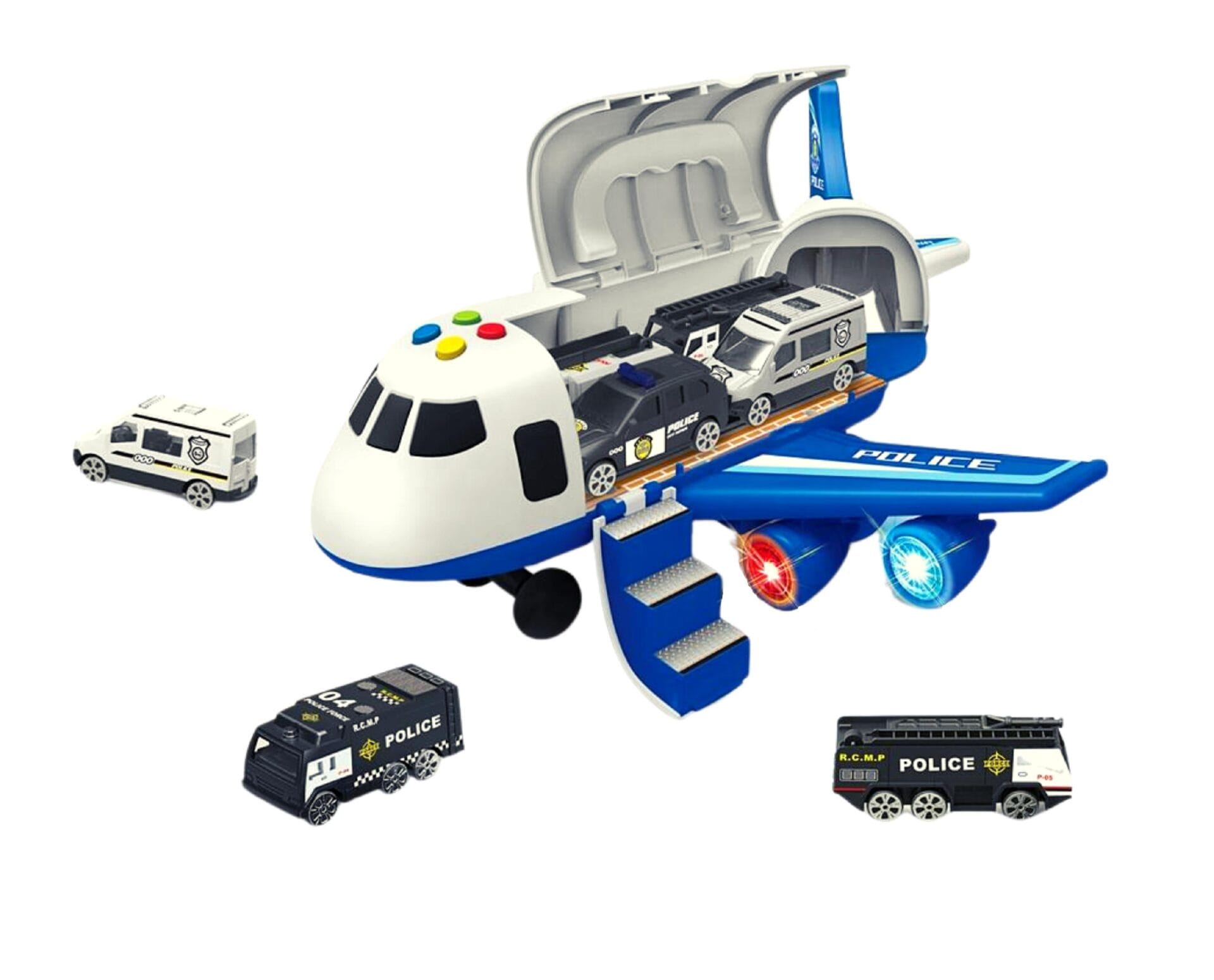 Avionul este echipat cu patru butoane care activeaza sunetul si efectele de lumina.(luminile de sub aripi se aprind) si un maner practic care faciliteaza transportul avionului.