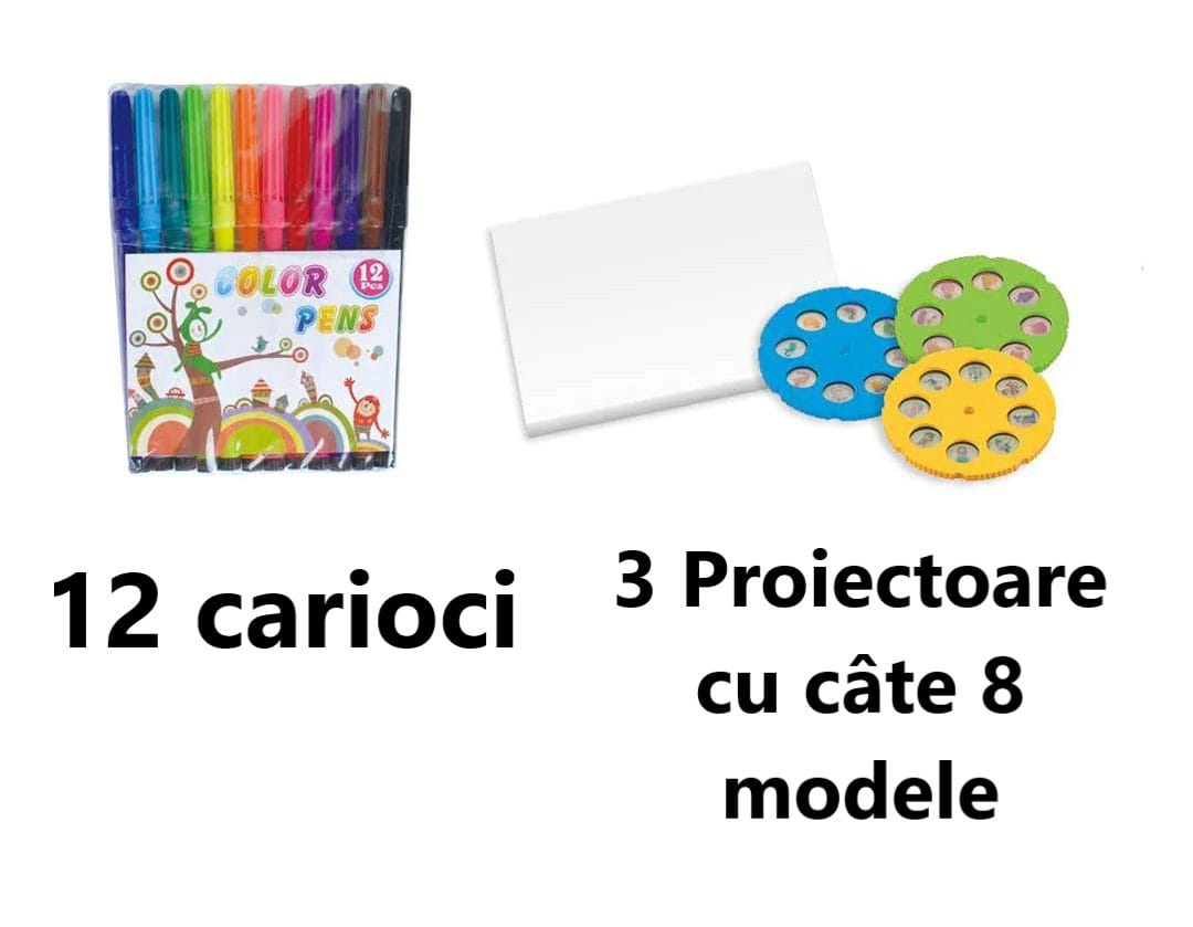 Cu 12 carioci incluse, copiii vor avea toate instrumentele necesare pentru a-si dezvolta creativitatea si imaginatia. Proiectorul este usor de folosit si poate fi ajustat pentru a proiecta imagini de diferite dimensiuni. Discurile cu sabloane pot fi schimbate si pot fi utilizate pentru a desena diferite animale, flori, masini sau orice altceva copilul doreste.