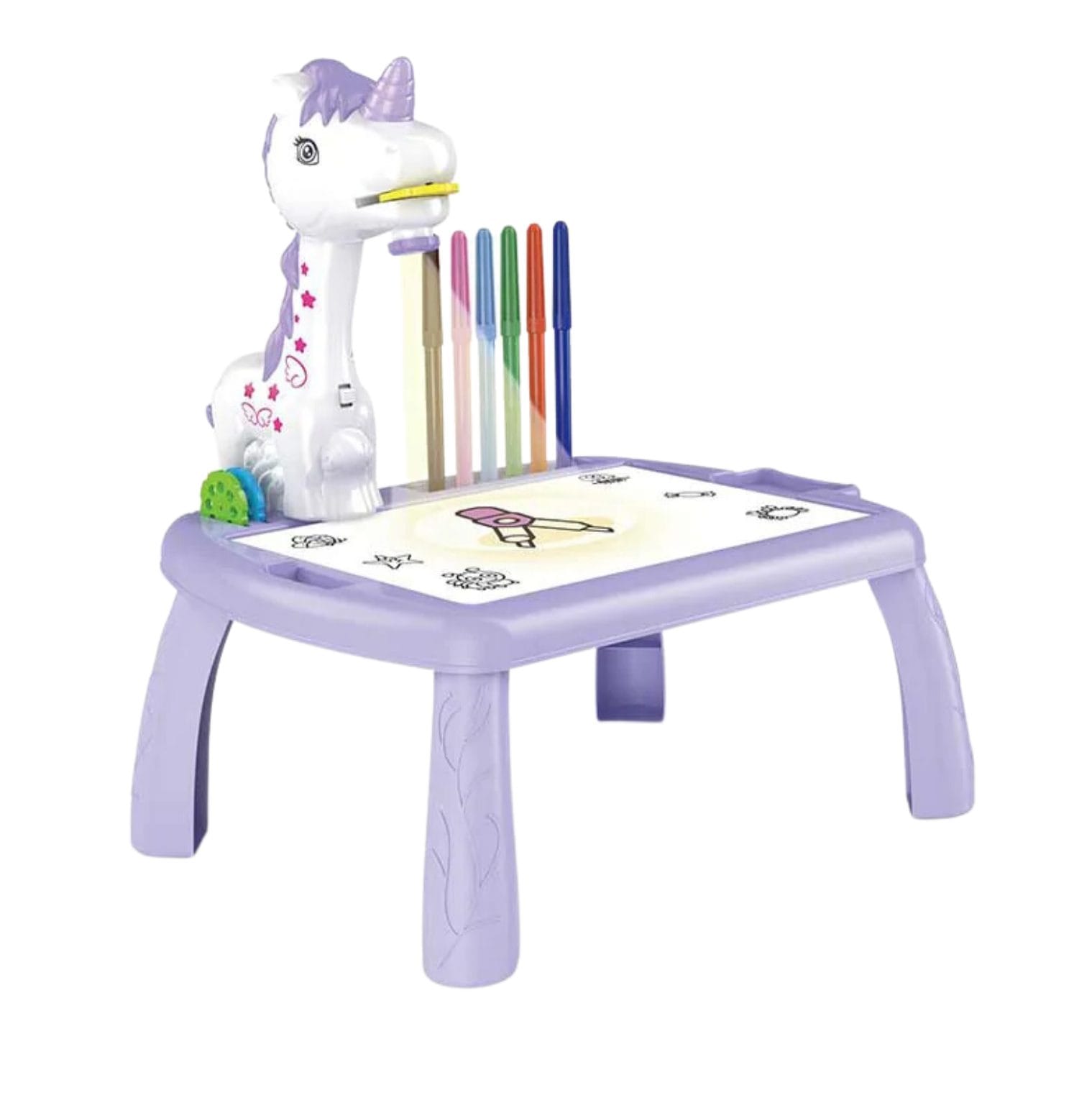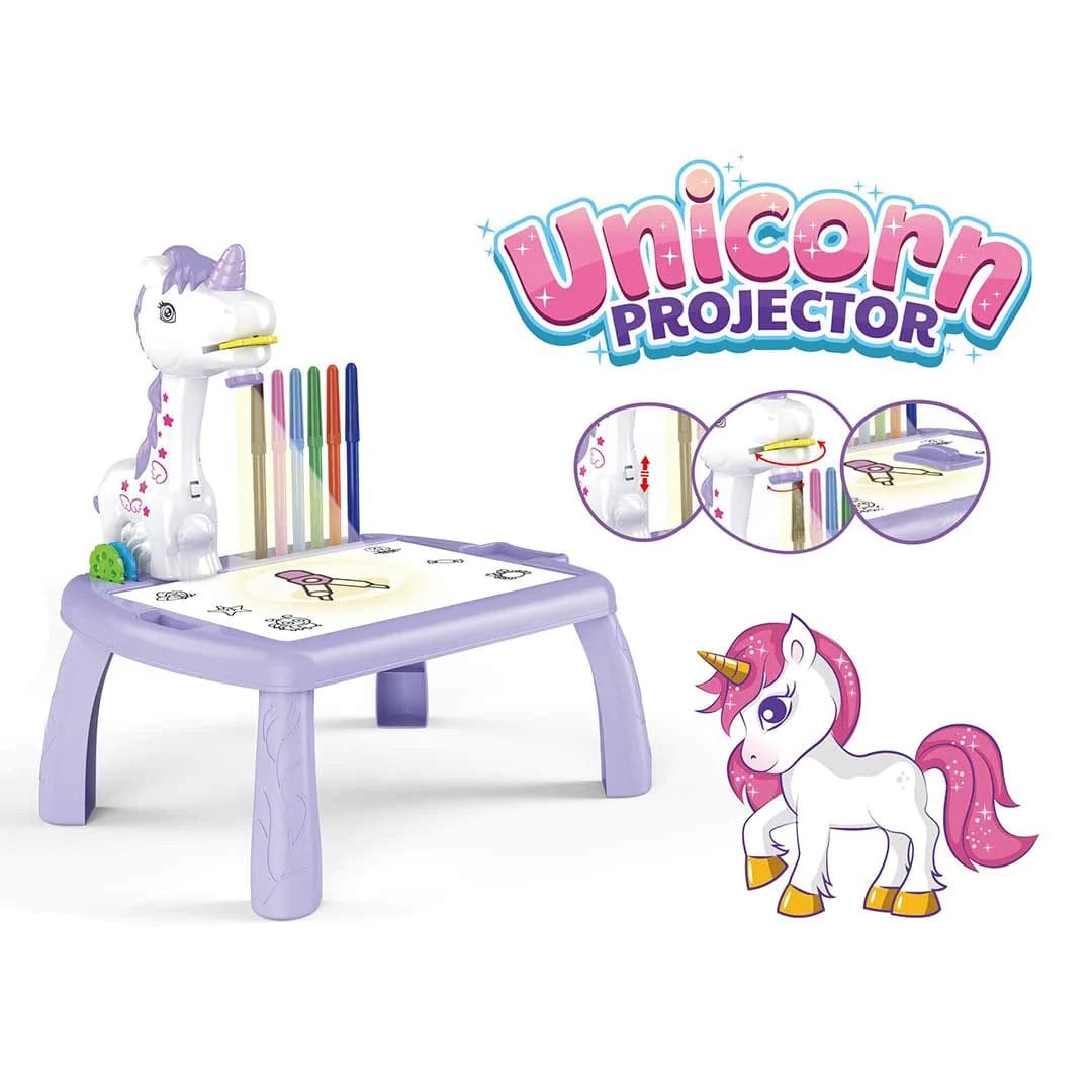 Resigilat - Set Masuta pentru Desen cu Proiector Holografic si Accesorii, 3 Discuri cu 24 Modele, Unicorn, 12 Carioci, Mov, 32x29.5x23 Cm, + 3 Ani