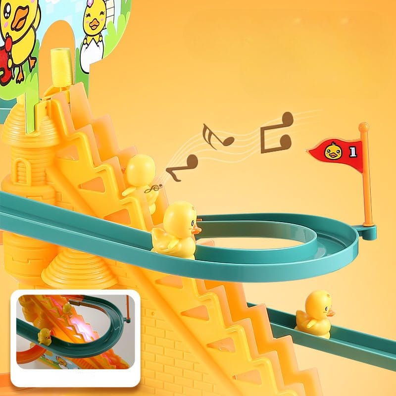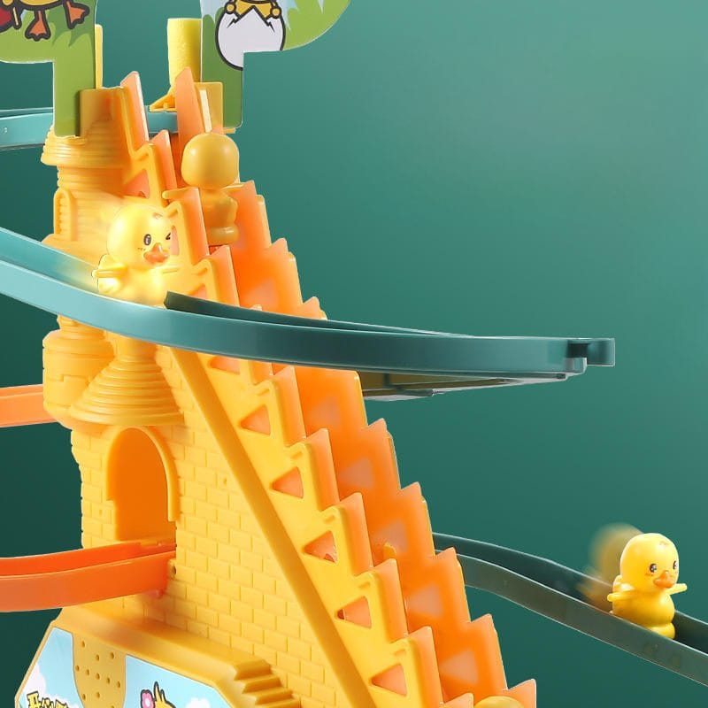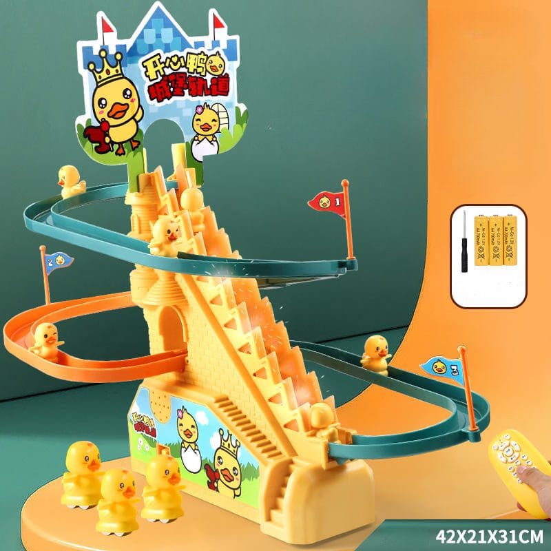 Acest tobogan este prevazut cu o scara rulanta pe care urca ratustele si o pista de alunecare foarte rapida si interactiva.