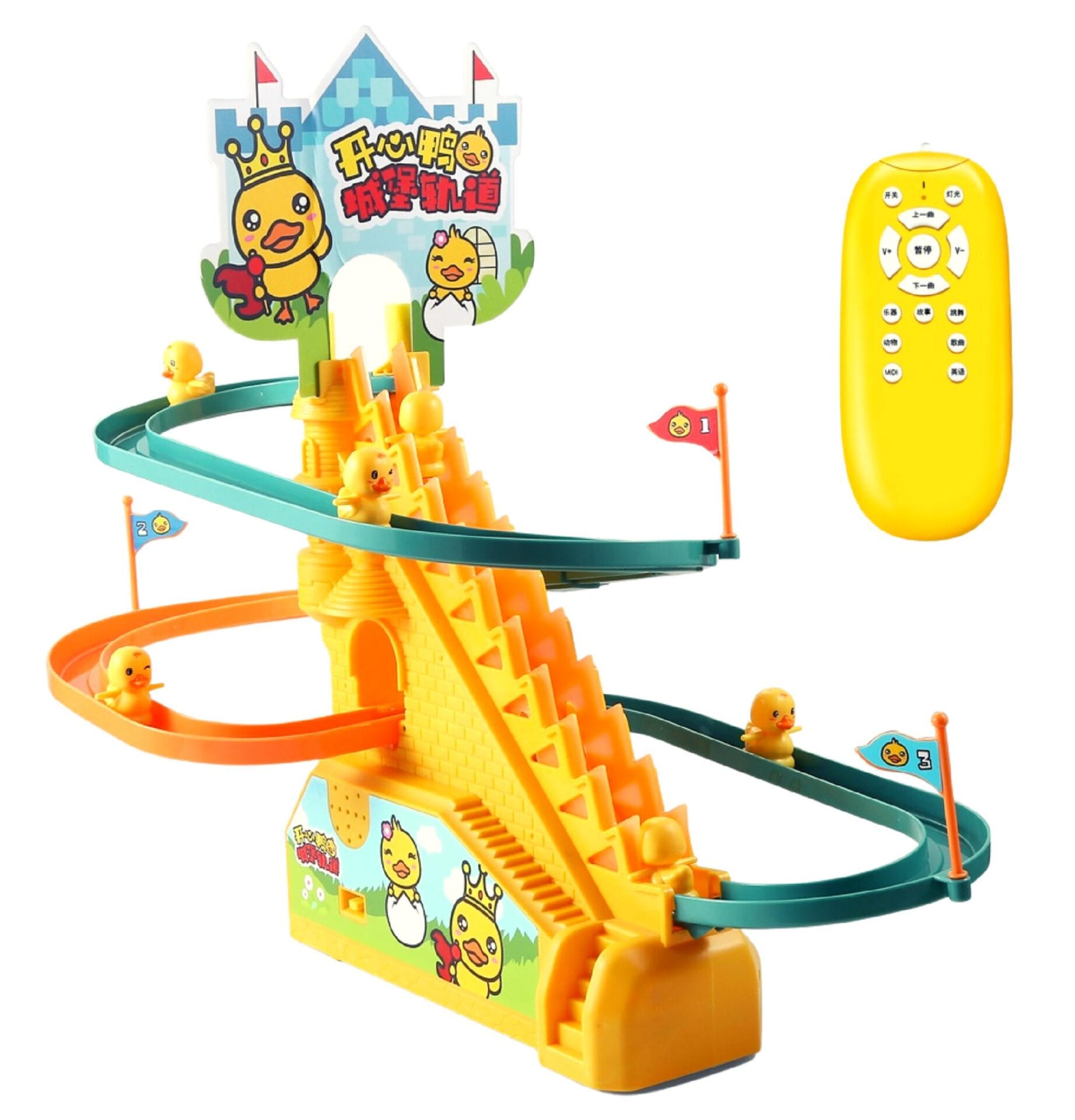 Produsul vine cu lumini LED intermitente, usor de asamblat, cu surubelnita inclusa, pista draguta de alunecare a ratustelor, piese interesante si muzica vesela (cu butoane pornit/oprit). De asemenea produsul este dotat cu telecomanda de control.