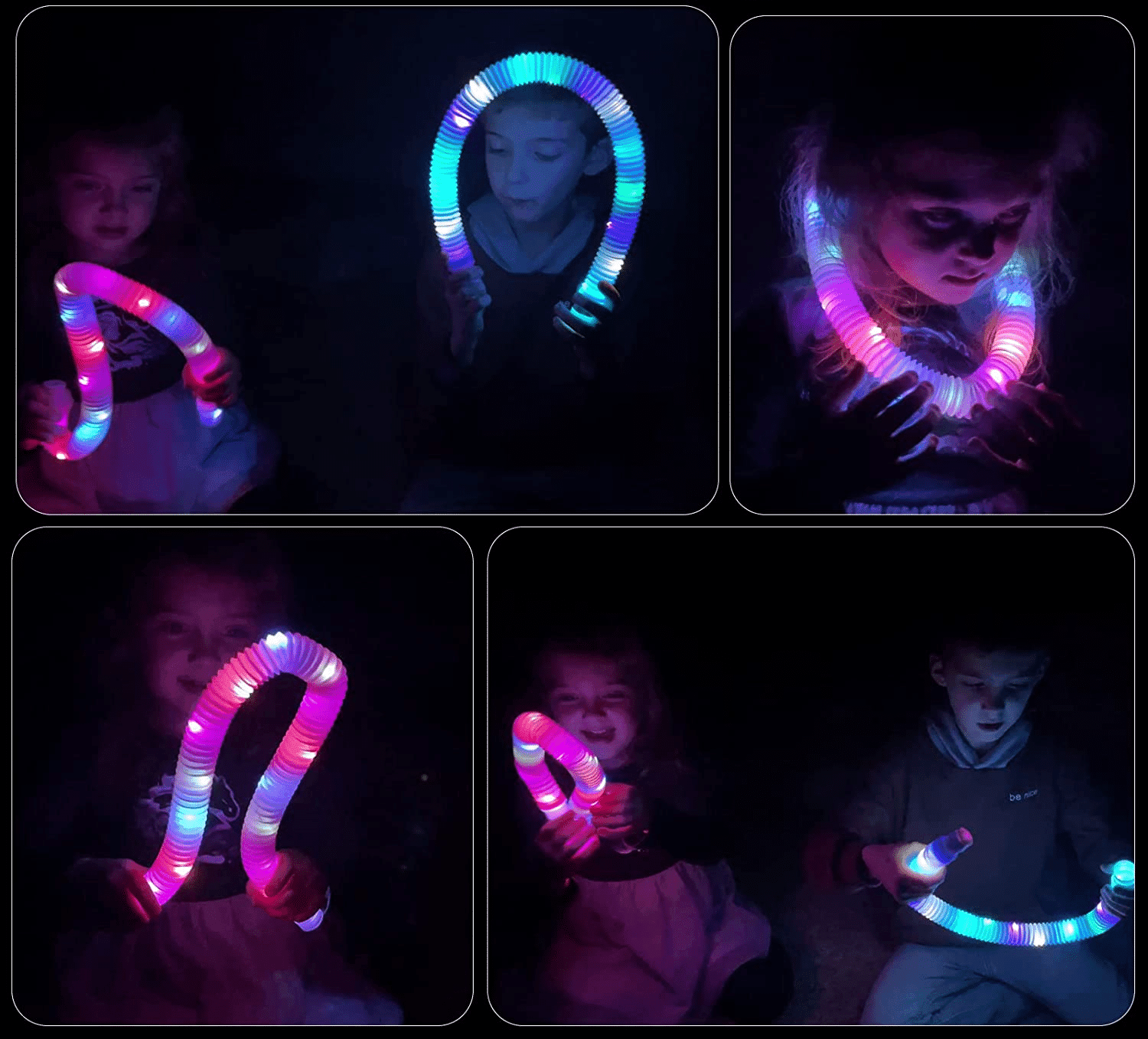 Tuburile pot fi indoite in diverse forme pentru o joaca cat mai creativa. Ele pot fi atasate impreuna pentru a forma un tub foarte lung, multicolor si luminos.