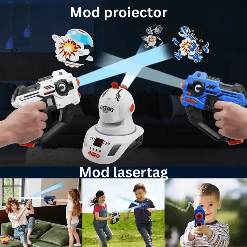 Proiectorul surprinde prin 3 moduri: lupta laser (laser tag), mini bourse, desene animate etc. Transforma orice camera, curte sau parc intr-un scenariu SF cu extraterestri, dinozauri si multe altele!